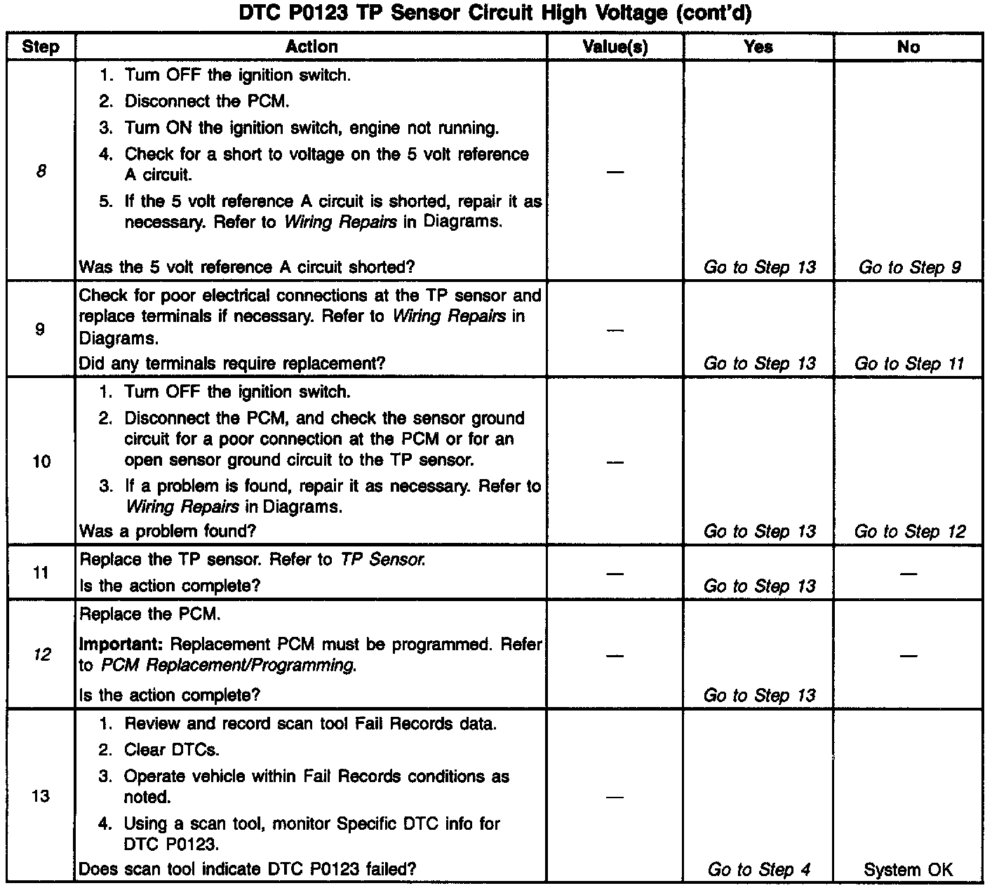 The Throttle Position (TP) sensor circuit provides a voltage signal that changes relative to throttle blade angle. The signal voltage will vary from below 1 volt at closed throttle to about 4 volts at Wide Open Throttle (WOT). The TP signal is one of the most important inputs used by the PCM for fuel control and most of the PCM-controlled outputs. DTC P0123 will set when the PCM detects an excessively high signal voltage on the throttle position sensor signal circuit.