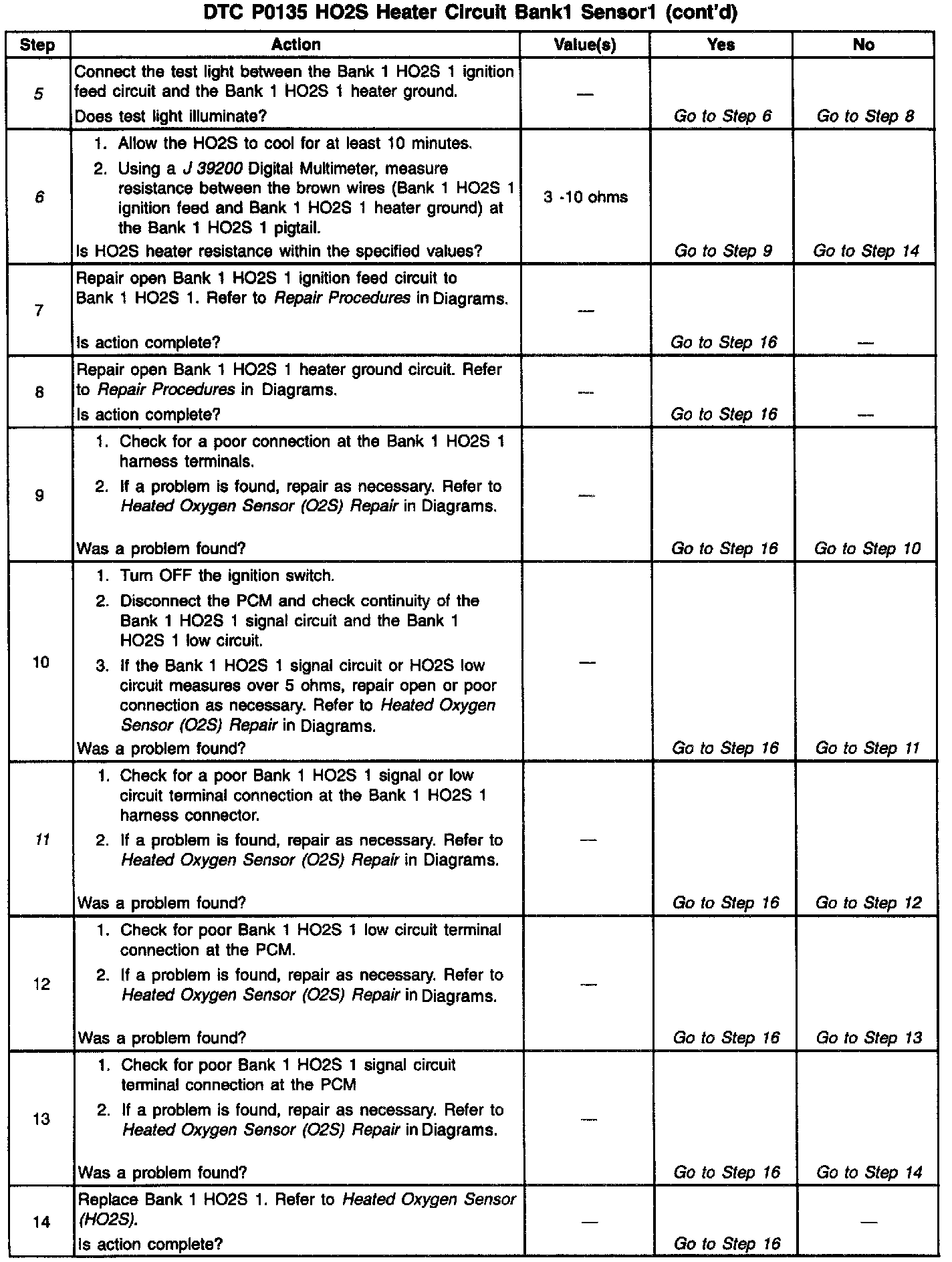 6. This step checks for an open or shorted HO2S heater element. The heater element resistance will vary according to HO2S temperature (a hot HO2S heater element will measure a much higher resistance than a HO2S heater element at room temperature). It is important to allow the HO2S to cool before measuring HO2S heater element resistance.