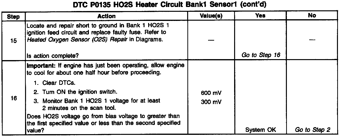 Heated oxygen sensors are used to minimize the amount of time required for closed loop fuel control operation and to allow accurate catalyst monitoring. The oxygen sensor heater greatly decreases the amount of time required for fuel control sensors Bank 1 HO2S 1 and Bank 2 HO2S 1 to become active. Oxygen sensor heaters are required by catalyst monitor sensors Bank 1 HO2S 2 and Bank 1 HO2S 3 to maintain a sufficiently high temperature which allows accurate exhaust oxygen content readings further from the engine. The PCM will run the heater test only after a cold start (determined by engine coolant and intake air temperature at the time of start-up) and only once during an ignition cycle. When the engine is started the PCM will monitor the HO2S voltage. When the HO2S voltage indicates a sufficiently active sensor, the PCM looks at how much time has elapsed since start-up. If the PCM determines that too much time was required for the Bank 1 HO2S 1 to become active, a DTC P0135 will set. The time it should take the HO2S to reach operating temperature is based on the engine coolant temperature at start-up and the average Mass Air Flow since start-up (higher average airflow or higher start-up engine coolant temperature = shorter time to HO2S activity).