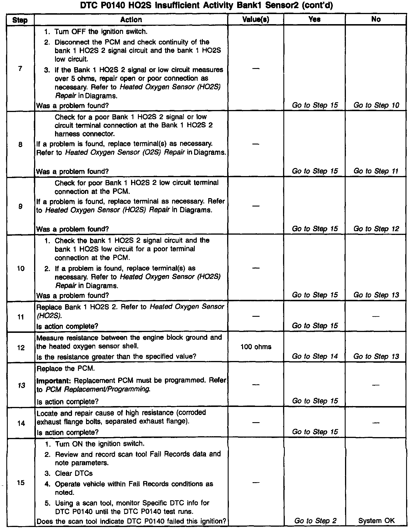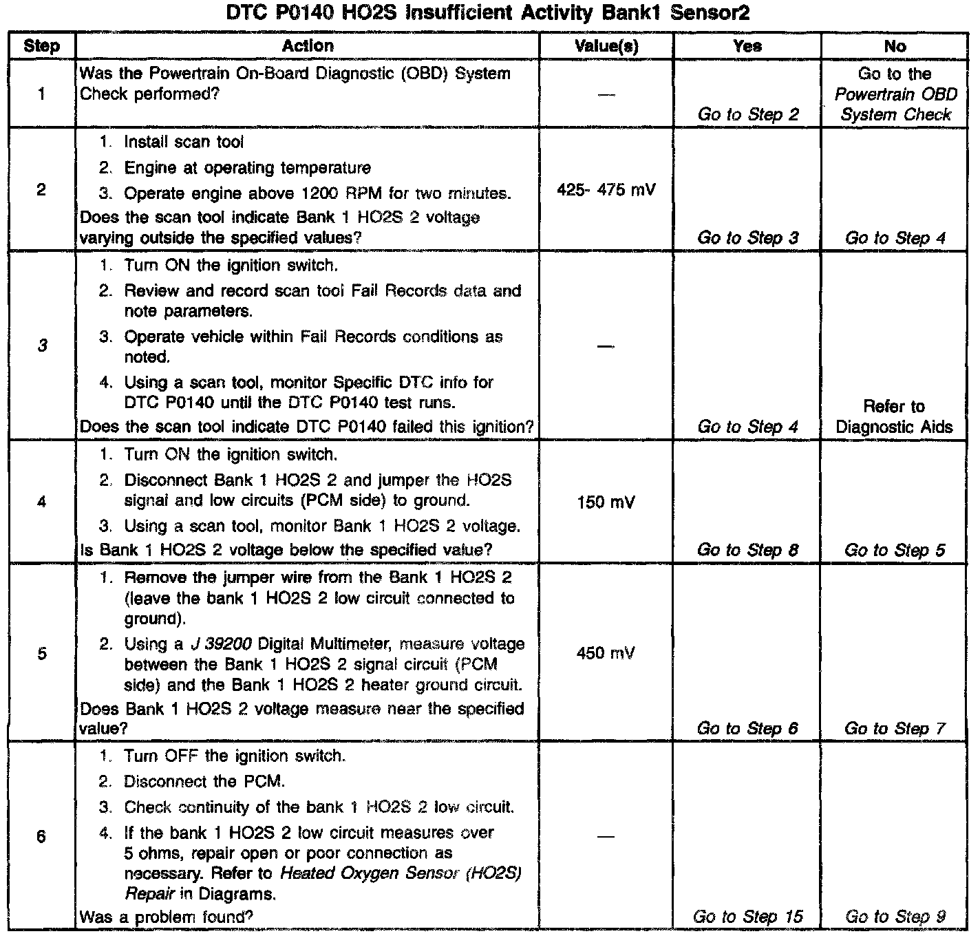 To control emissions of Hydrocarbons (HC), Carbon Monoxide (CO), and Oxides of Nitrogen (NOx), a three-way catalytic converter is used. The catalyst within the converter promotes a chemical reaction which oxidizes the HC and CO present in the exhaust gas, converting them into harmless water vapor and carbon dioxide. The catalyst also reduces NOx, converting it to nitrogen. The PCM has the ability to monitor this process using the Bank 1 HO2S 2 and the Bank 1 HO2S 3 heated oxygen sensors. The Bank 1 HO2S 2 sensor produces an output signal which indicates the amount of oxygen present in the exhaust gas entering the three-way catalytic converter. The Bank 1 HO2S 3 sensor produces an output signal which indicates the oxygen storage capacity of the catalyst; this in turn indicates the catalyst's ability to convert exhaust gases efficiently. If the catalyst is operating efficiently, the Bank 1 HO2S 2 signal will be far more active than that produced by the Bank 1 HO2S 3 sensor If the Bank 1 HO2S 2 signal voltage remains at or near the 450mV bias for an extended period of time, DTC P0140 will be set.