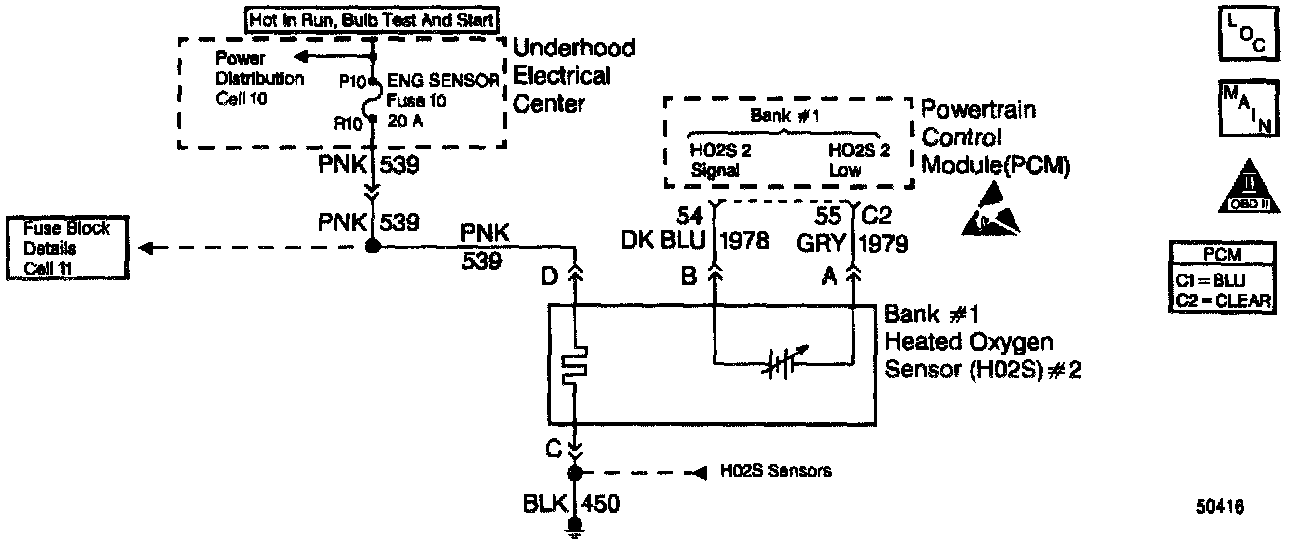 - Faulty HO2S heater or heater circuit - With the ignition ON the HO2S voltage displayed on a scan tool should gradually drop to below 300mV. If not, disconnect the HO2S and connect a test light between the HO2S ignition feed and heater ground circuits. If the test light does not light, repair the open ignition feed or sensor ground circuit as necessary. If the test light lights and the HO2S signal and low circuits are OK, replace the HO2S.