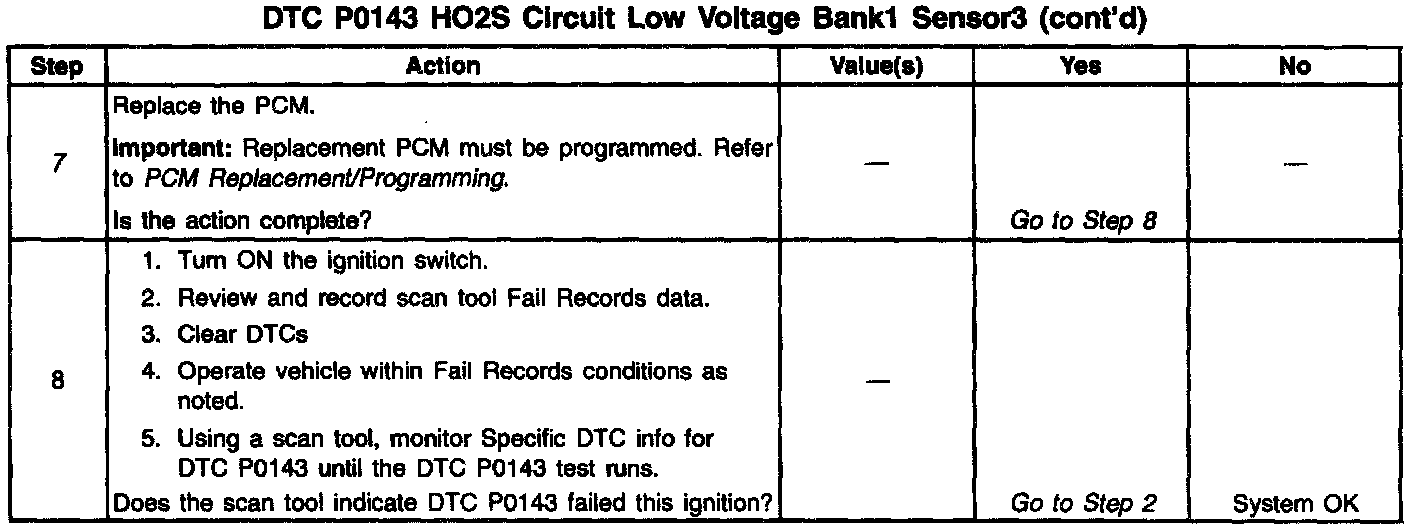 3. DTC P0143 being set during power enrichment mode conditions may indicate a condition described in the Diagnostic Aids above. If the DTC P0143 test passes while the Fail Records conditions are being duplicated, an intermittent condition is indicated. Review the Fail Records vehicle mileage since the diagnostic test last failed. This may help determine how often the condition that caused the DTC to be set occurs.