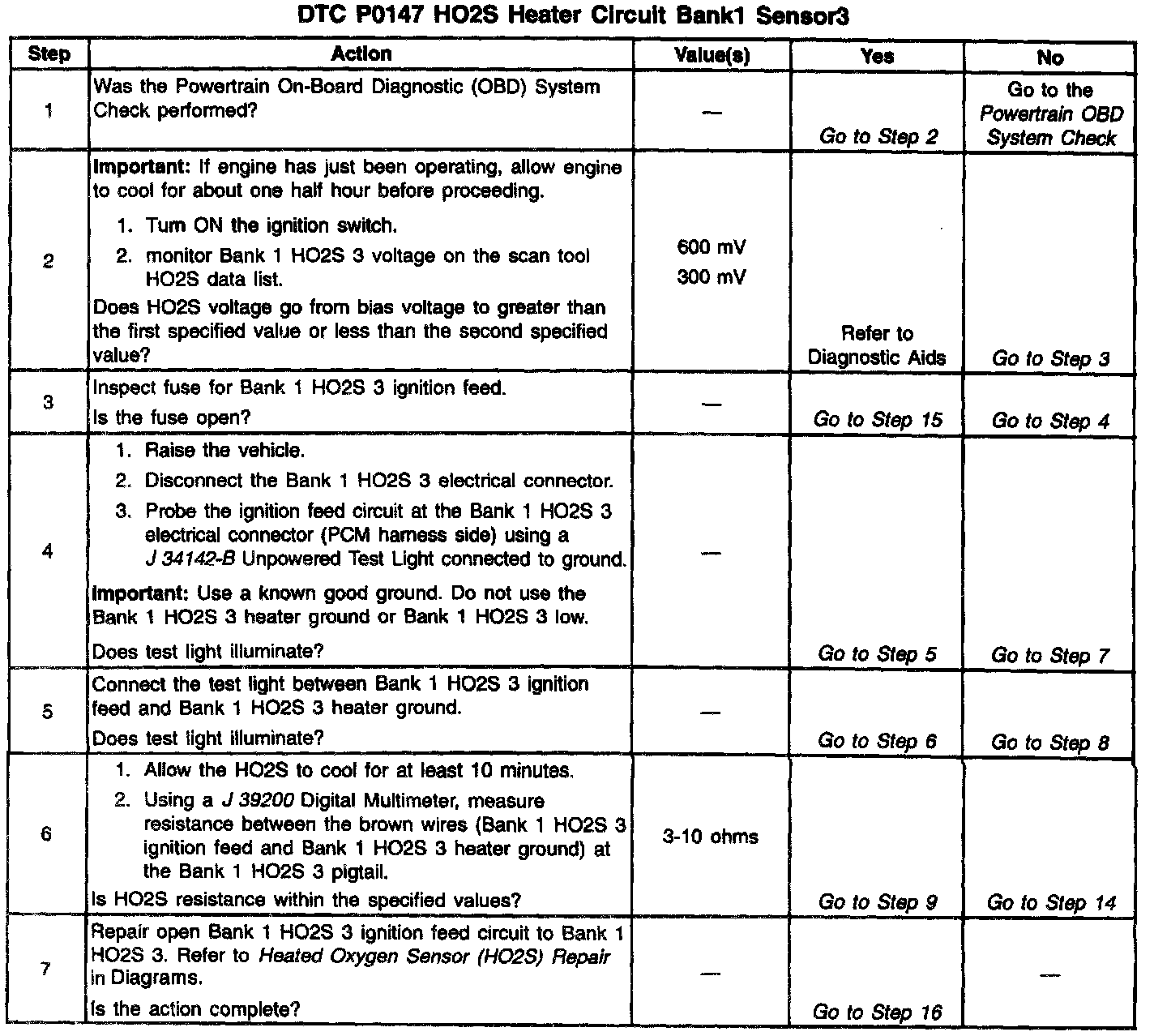 Heated oxygen sensors are used to minimize the amount of time required for closed loop fuel control operation and to allow accurate catalyst monitoring. The oxygen sensor heater greatly decreases the amount of time required for fuel control sensors Bank 1 HO2S 1 and Bank 2 HO2S 1 to become active. Oxygen sensor heaters are required by catalyst monitor sensors Bank 1 HO2S 2 and Bank 1 HO2S 3 to maintain a sufficiently high temperature which allows accurate exhaust oxygen content readings further from the engine. The PCM will run the heater test only after a cold start (determined by engine coolant and intake air temperature at the time of start-up) and only once during an ignition cycle. When the engine is started the PCM will monitor the HO2S voltage. When the Bank HO2S voltage indicates a sufficiently active sensor, the PCM looks at how much time has elapsed since start-up. If the PCM determines that too much time was required for the Bank 1 HO2S 3 to become active, a DTC P0147 will set. The time it should take the HO2S to reach operating temperature is based on the engine coolant temperature at start-up and the average Mass Air Flow since start-up (higher average airflow or higher start-up engine coolant temperature = shorter time to HO2S activity).