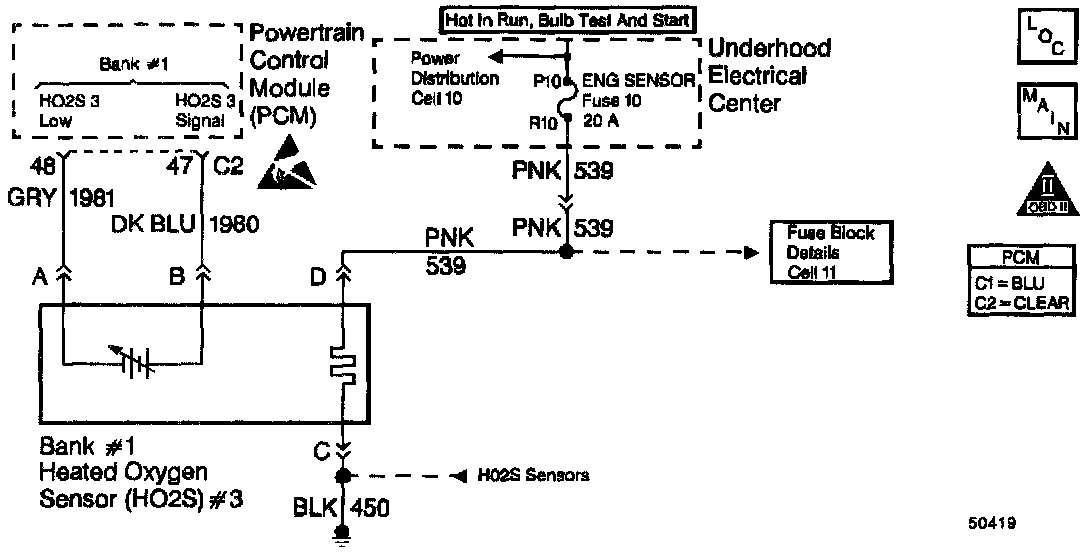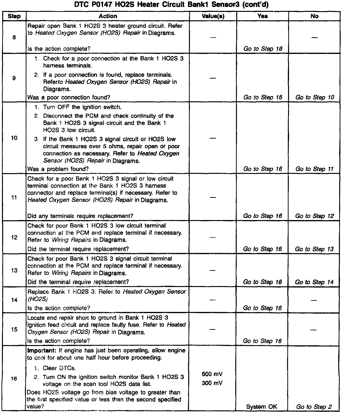 - Bank 1 HO2S 3 voltage remains within 150mV of the bias voltage (about 450mV) for a longer amount of time than it should. The amount of time ranges between 30 seconds and 5 minutes depending on engine coolant temperature at start-up and average air flow since start-up.