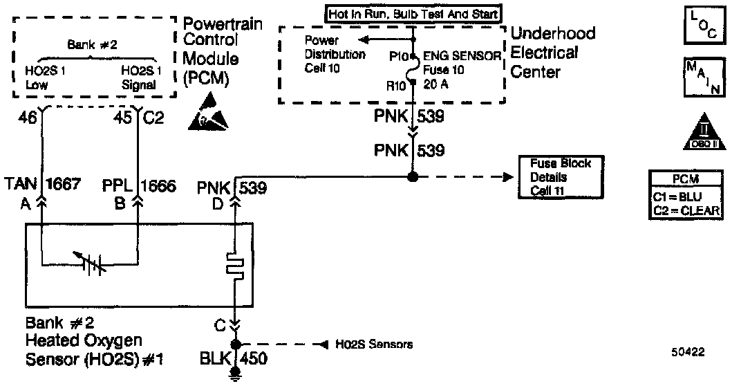 The PCM supplies a bias voltage of about 450mV between the HO2S signal and low circuits. When measured with a 10 megohm digital voltmeter, this may display as low as 320mV. The oxygen sensor varies the voltage within a range of about 1000mV when the exhaust is rich, down through about 10mV when exhaust is lean. The PCM constantly monitors the HO2S signal during closed loop operation and compensates for a rich or lean condition by decreasing or increasing injector pulse width as necessary. If the Bank 2 HO2S 1 voltage remains excessively high for an extended period of time, DTC P0152 will be set.