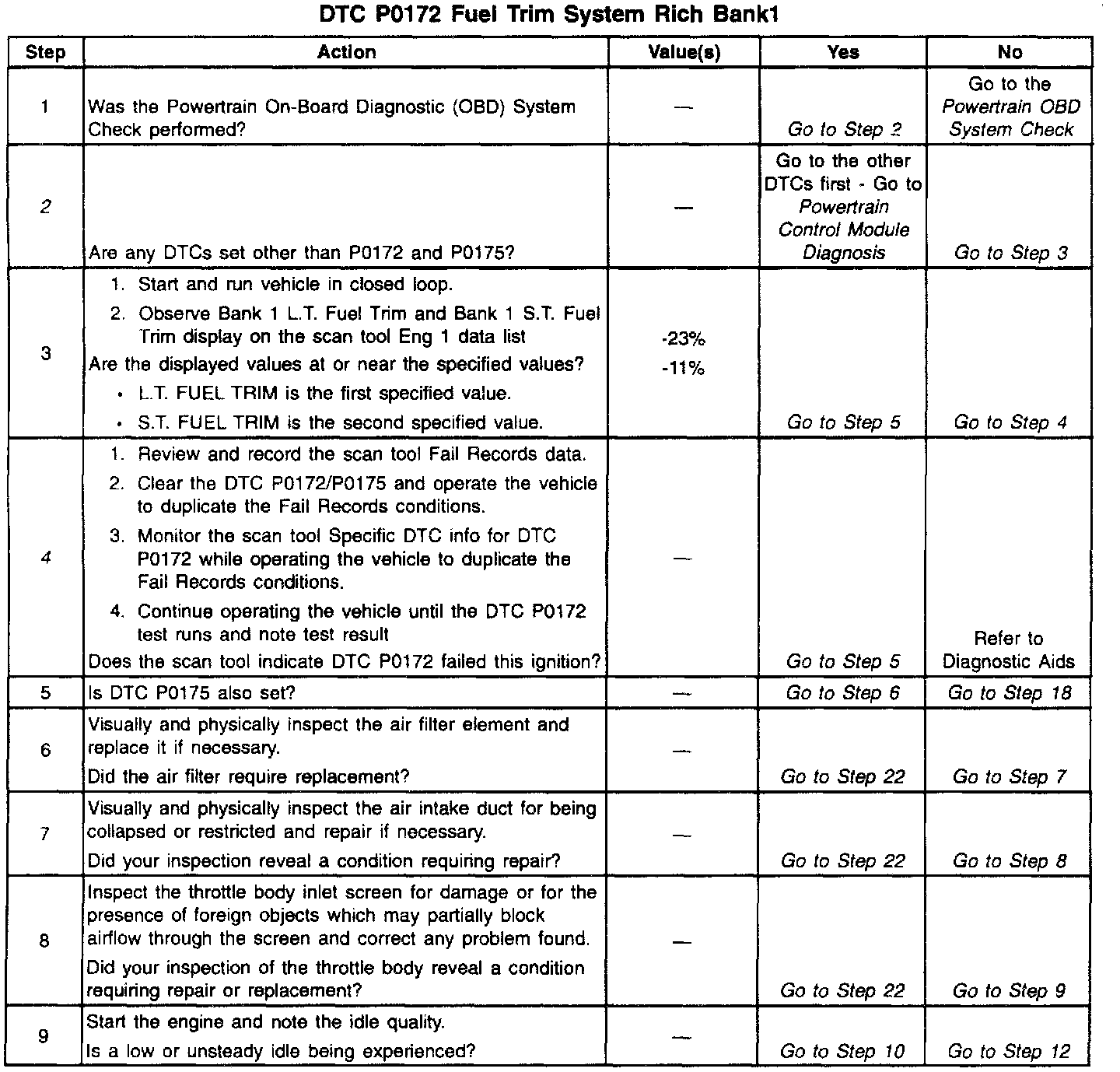 2. DTCs other than P0172 and P0175 may indicate a condition present which may cause a lean condition. If this is the case, repairing the condition which caused the other DTC will most likely correct the DTC P0172/P0175.