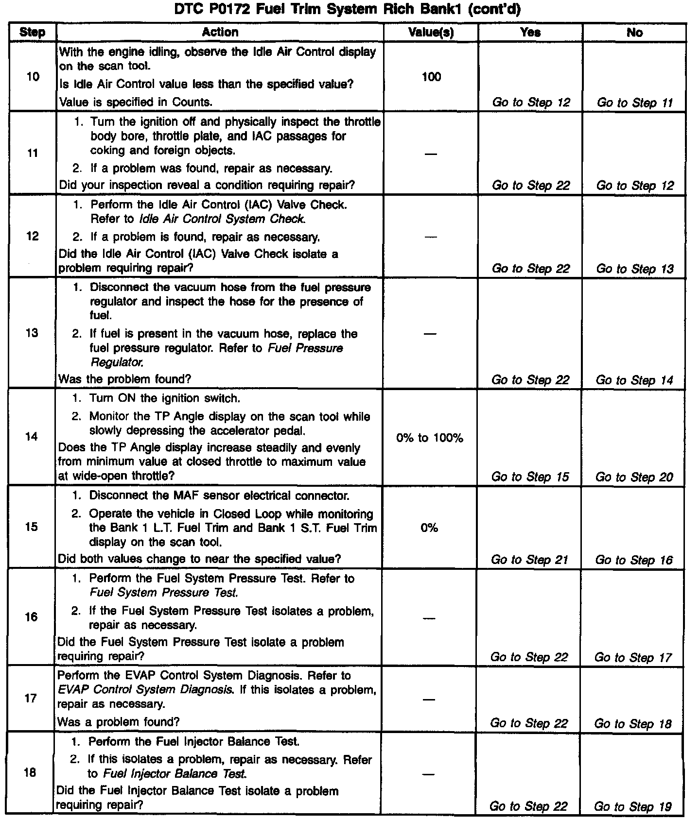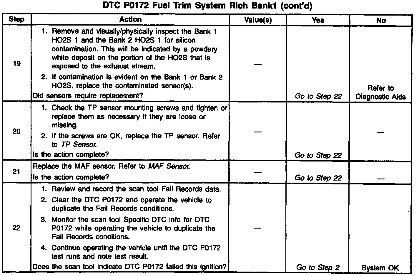 4. If the DTC P0172 test passes while the Fail Records conditions are being duplicated, the rich condition is intermittent. Refer to Diagnostic Aids or Symptoms for additional information on diagnosing intermittent problems. Testing and Inspection
