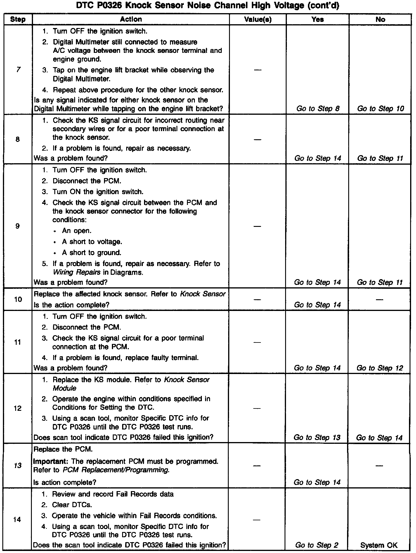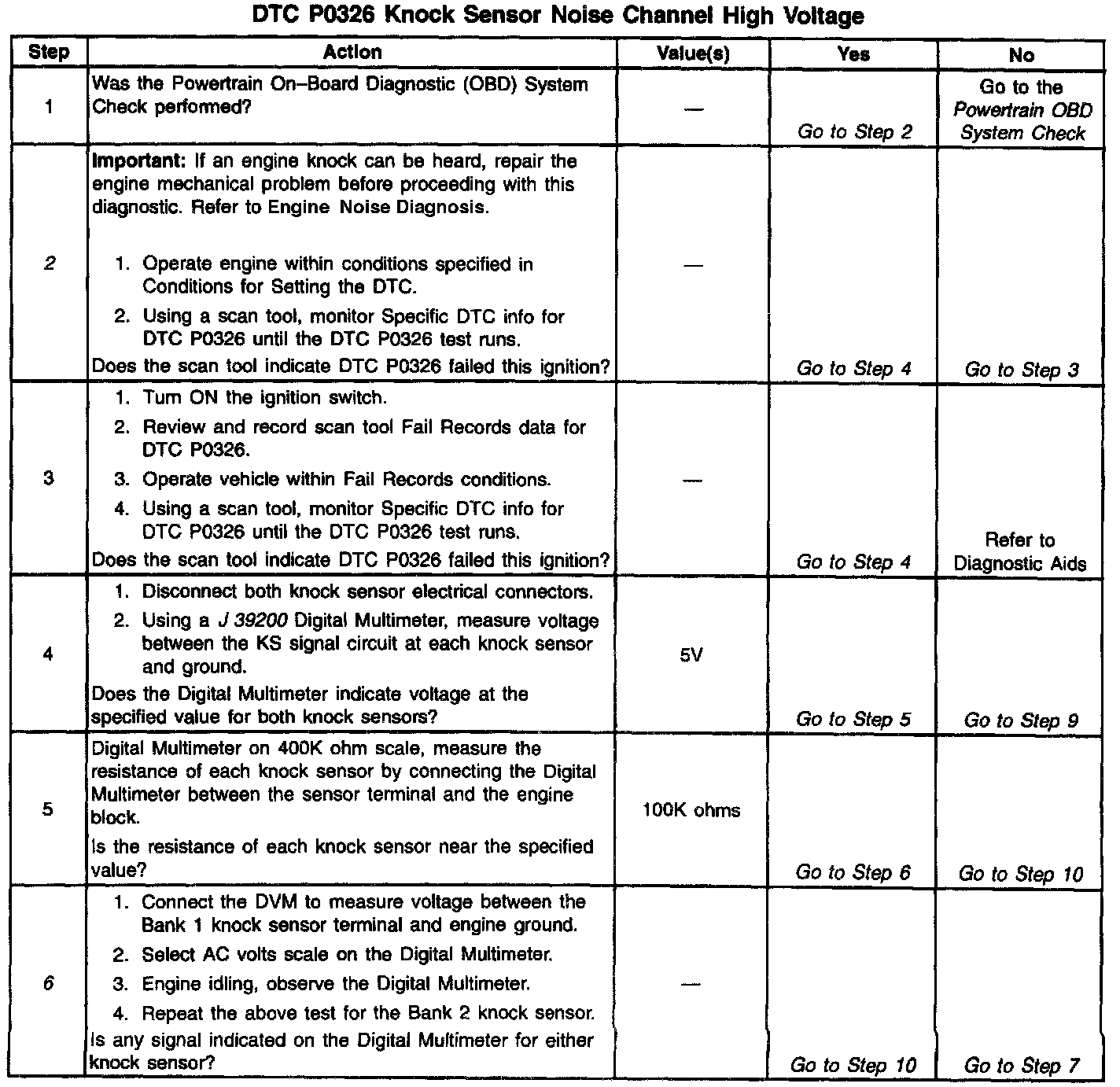 The PCM determines whether the knock sensors and related wiring are operating properly by monitoring the voltage level on the noise channel. The noise channel allows the PCM to diagnose the KS system by allowing the PCM to learn the amount of normal engine mechanical noise present. Normal engine noise varies depending on engine speed and load. When the PCM determines that an abnormally high noise channel voltage level is being experienced, a DTC P0326 will set.