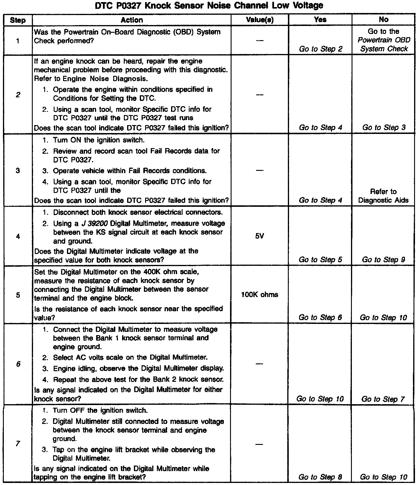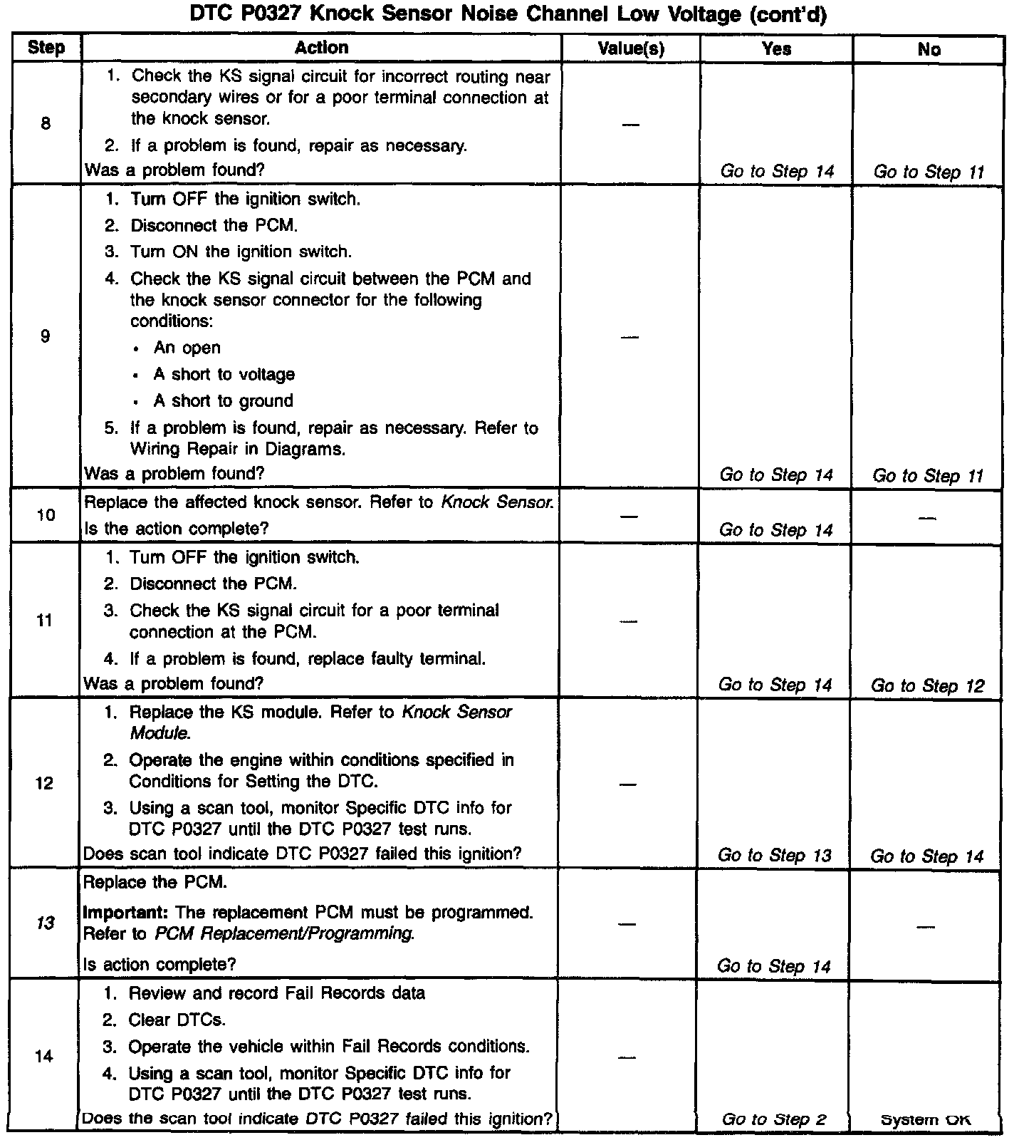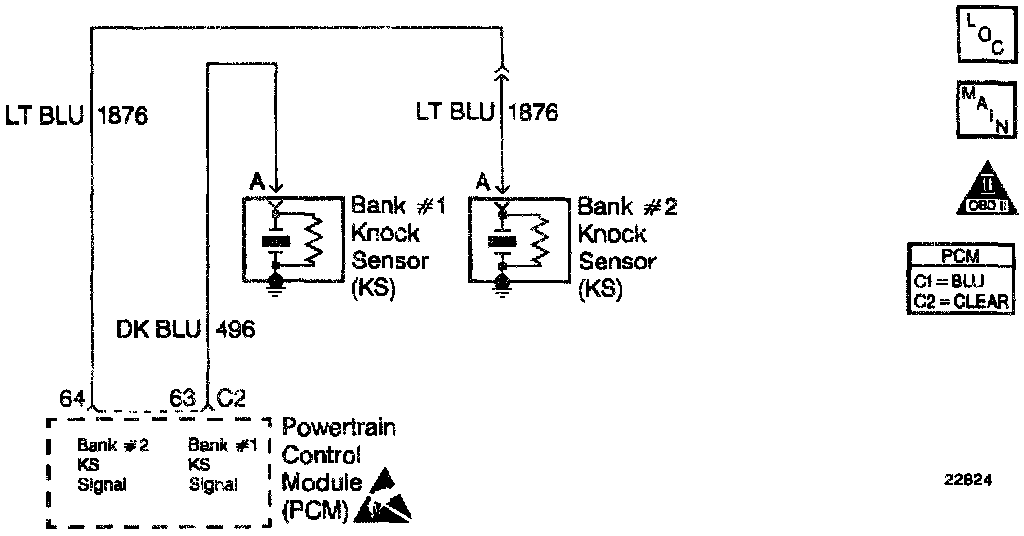 The PCM determines whether the knock sensors and related wiring are operating properly by monitoring the voltage level on the noise channel. The noise channel allows the PCM to diagnose the Knock Sensor (KS) system by allowing the PCM to learn the amount of normal engine mechanical noise present. Normal engine noise varies depending on engine speed and load. When the PCM determines that an abnormally low noise channel voltage level is being experienced. a DTC P0327 will set.