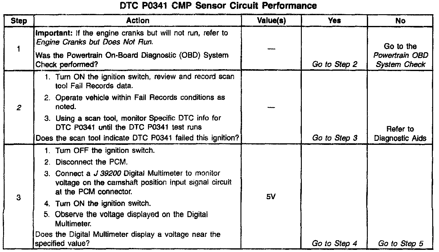 The camshaft position PCM input is produced by the ignition control module. The ICM produces the camshaft position PCM input by filtering the Camshaft Position (CMP) sensor pulses when the engine is running and Crankshaft Position (CKP) sync pulses are also being received. The PCM uses the camshaft position PCM input pulses to initiate sequential fuel injection and to determine crankshaft position for the misfire diagnostic. The PCM constantly monitors the number of pulses on the camshaft position PCM input circuit and compares the number of camshaft position PCM input pulses to the number of 18X reference pulses and the number of 3X reference pulses being received. If the PCM receives an incorrect number of pulses on the camshaft position PCM input circuit, DTC P0341 will set and the PCM will initiate injector sequence without the camshaft position PCM input with a one in six chance that injector sequence is correct. The engine will continue to start and run normally, although the misfire diagnostic will be disabled.