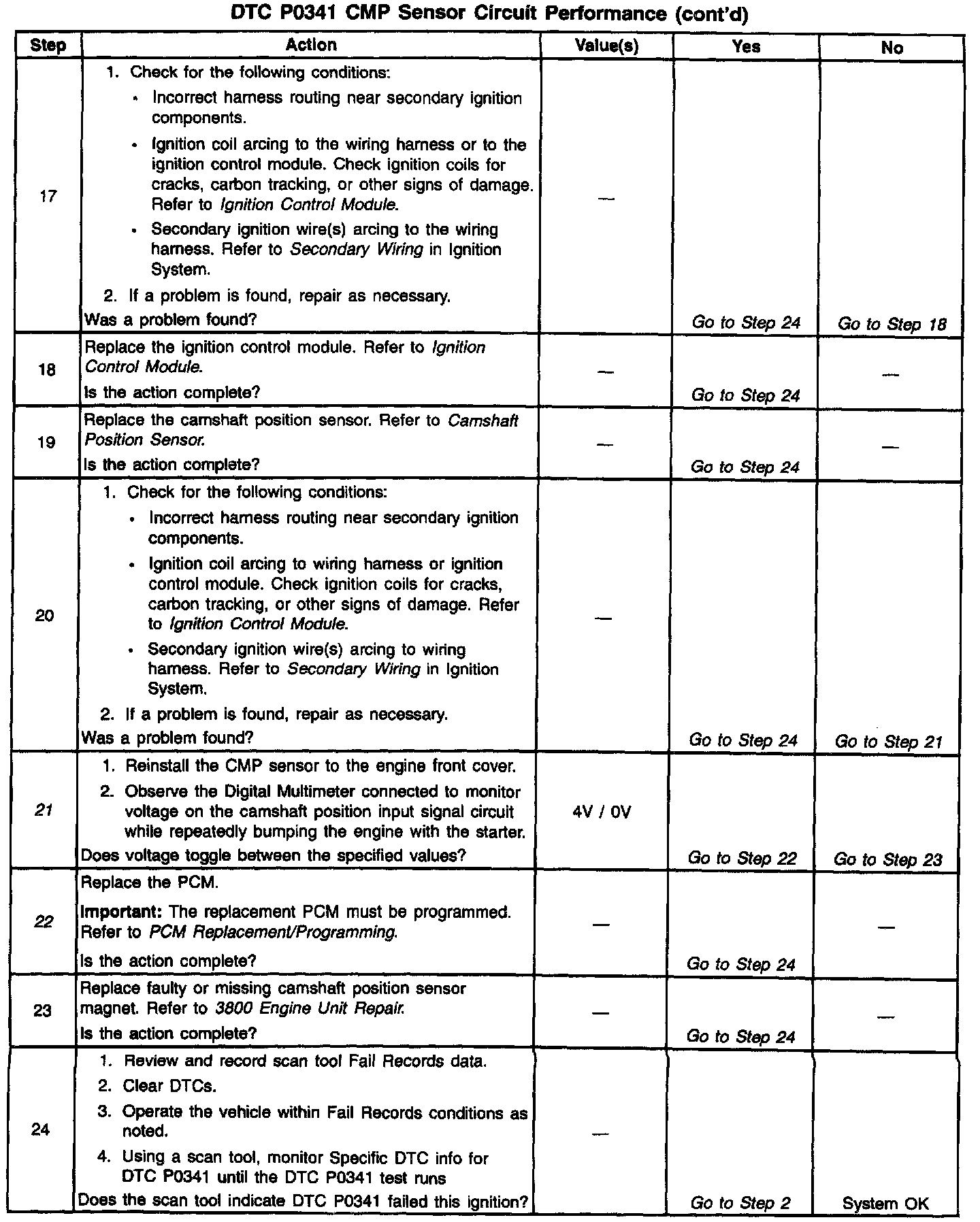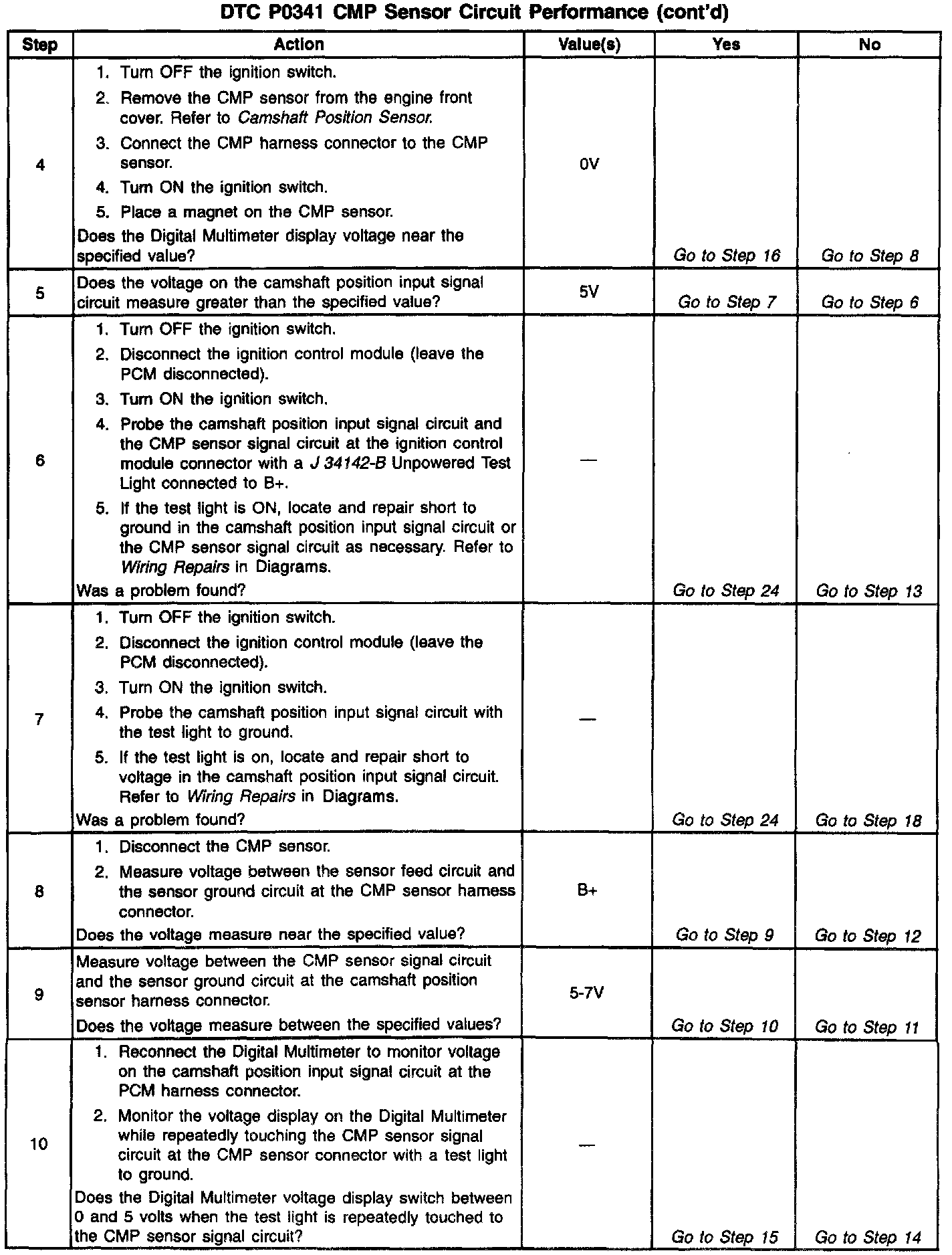 21. Determines whether the fault is being caused by a missing camshaft magnet or a faulty PCM. The voltage measured in this step should read around 4 volts, toggling to near 0 volts when the CMP sensor interfaces with the camshaft magnet.