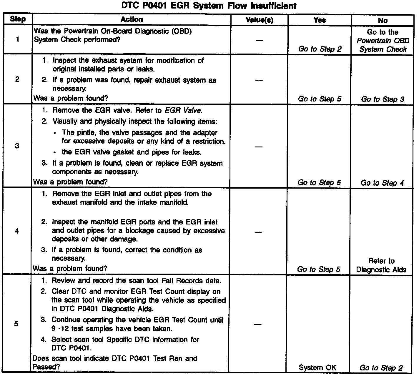 The PCM tests the EGR system during deceleration by momentarily commanding the EGR valve open while monitoring the Manifold Absolute Pressure (MAP) sensor signal. When the EGR valve is opened, the PCM should see a proportional increase in MAP. If the expected increase in MAP is not seen, the PCM notes the amount of error that was detected and adjusts an internal fail counter towards a fail threshold level. When the fail counter exceeds the fail threshold level, the PCM will set DTC P0401. The number of test samples required to accomplish this may vary according to the amount of detected flow error.