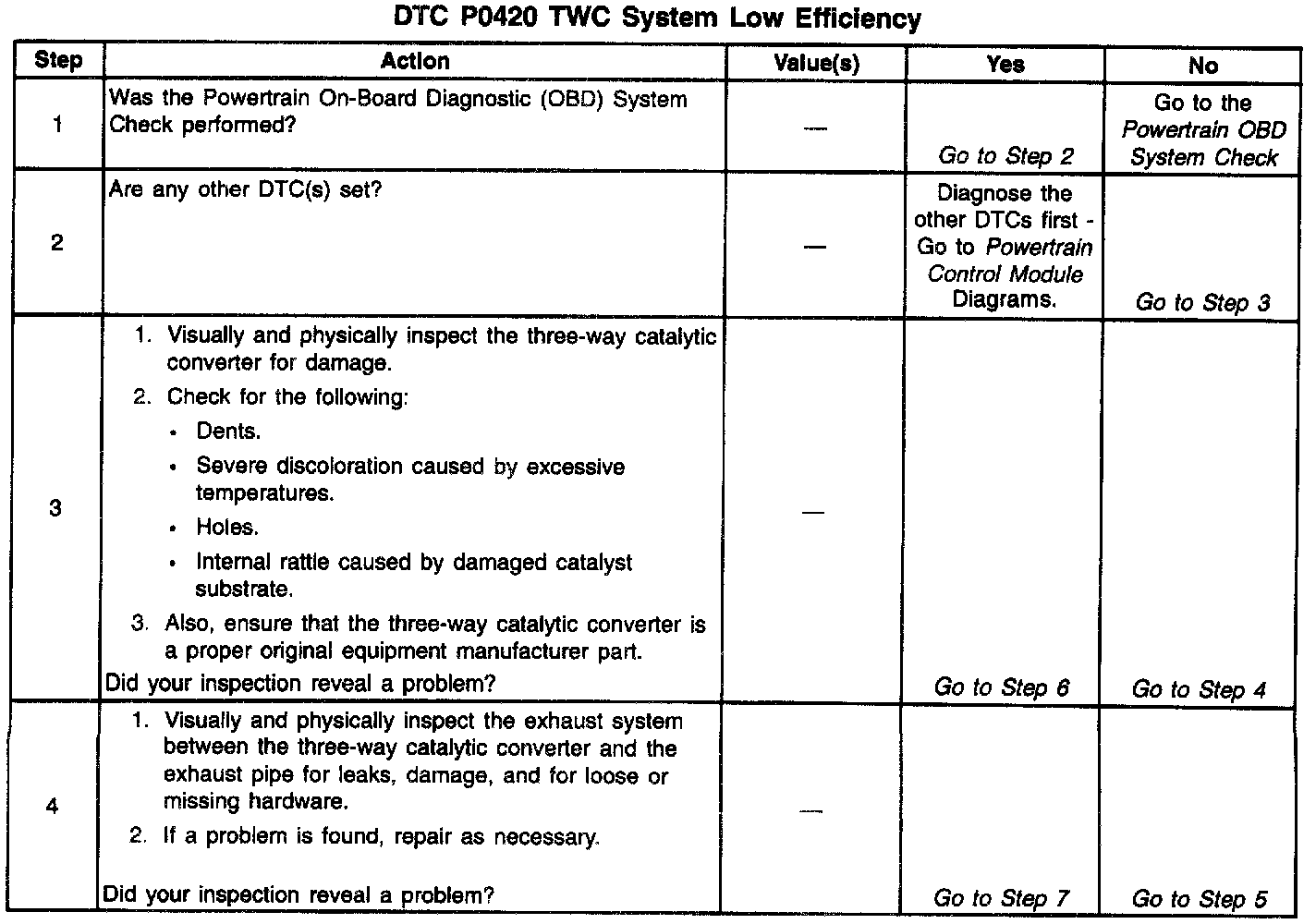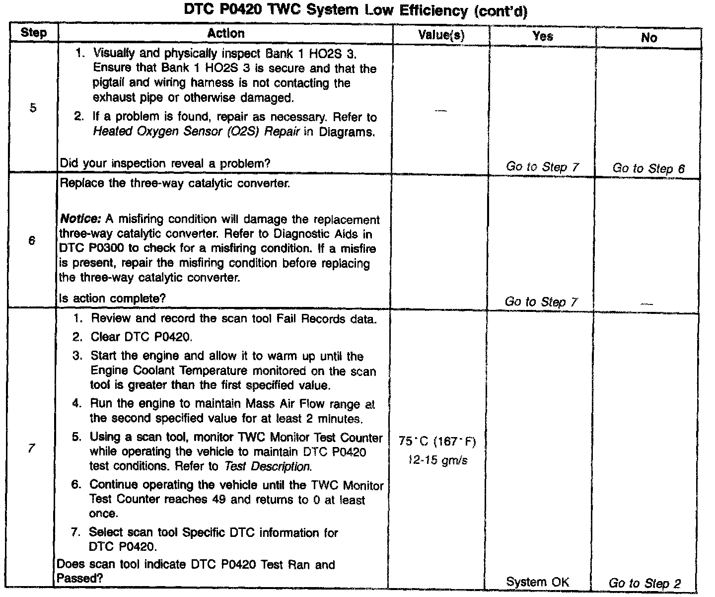 7. Difficulty completing the DTC P0420 test may be encountered in areas where test conditions cannot be maintained easily, especially in urban areas. To minimize the amount of driving required to complete the DTC P0420 test, use the procedure in Step 7 of the Diagnostic Chart.