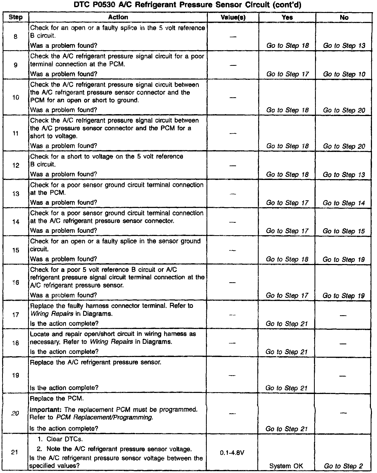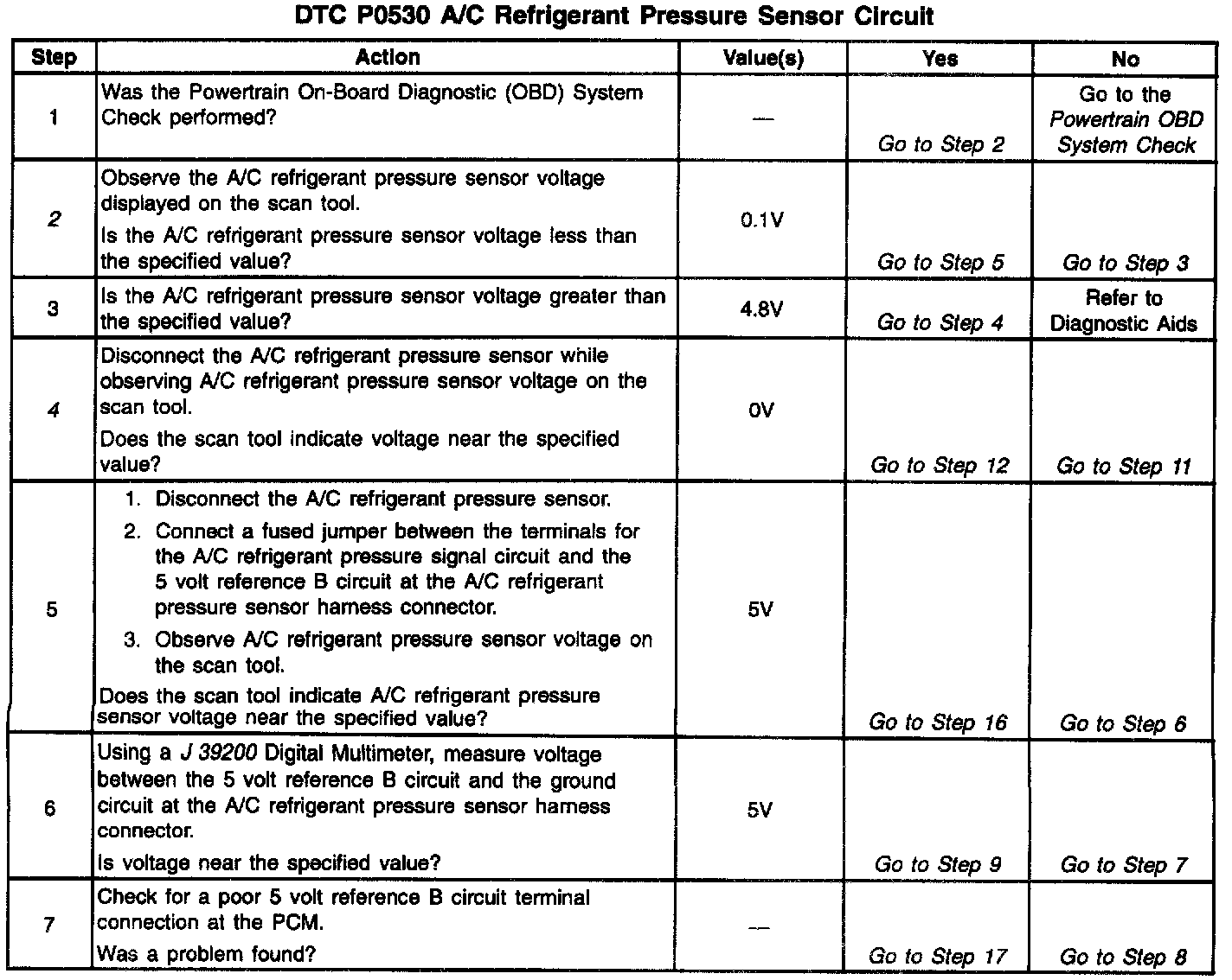 2. Normal A/C pressure sensor signal voltage is between 0.1 and 4.8 volts. If A/C voltage is within range, review Fail Records data to determine the conditions that were present when DTC P0530 set.