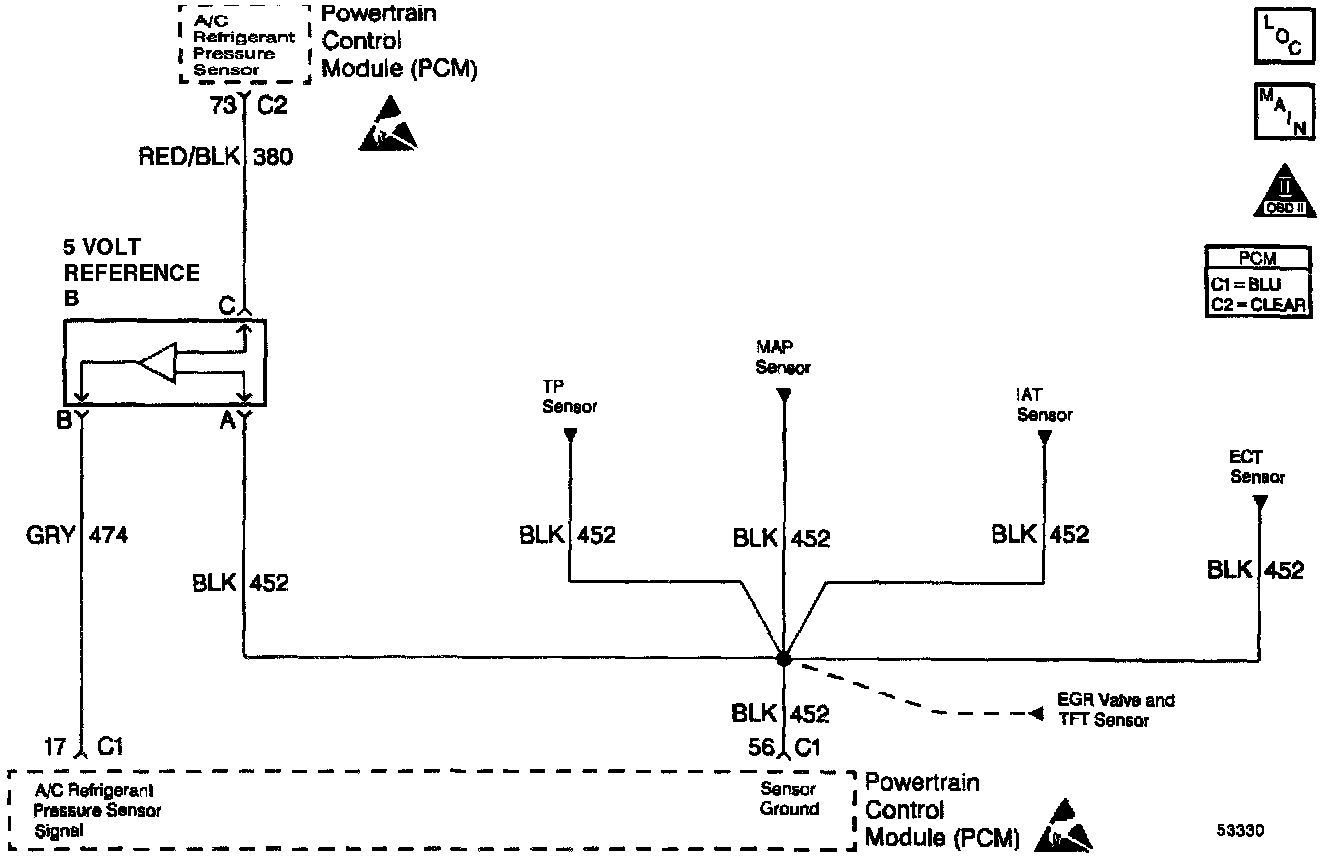 The A/C system uses an A/C refrigerant pressure sensor mounted in the high pressure side of the A/C refrigerant system to monitor A/C refrigerant pressure. The PCM uses this information to turn ON the engine coolant fans when the A/C refrigerant pressure is high and to keep the compressor disengaged when A/C refrigerant pressure is excessively high or low. The A/C refrigerant pressure sensor operates like other 3-wire sensors. The PCM applies a 5.0 volt reference and a sensor ground to the sensor. Changes in the A/C refrigerant pressure will cause the A/C refrigerant pressure input to the PCM to vary. The PCM monitors the A/C refrigerant pressure signal circuit and can determine when the signal is outside of the possible range of the sensor. When the signal is out of range (high or low) for a prolonged period of time, the PCM will set DTC P0530. When DTC P0530 is set, the PCM will not allow the A/C compressor clutch to engage. This is done to protect the compressor.