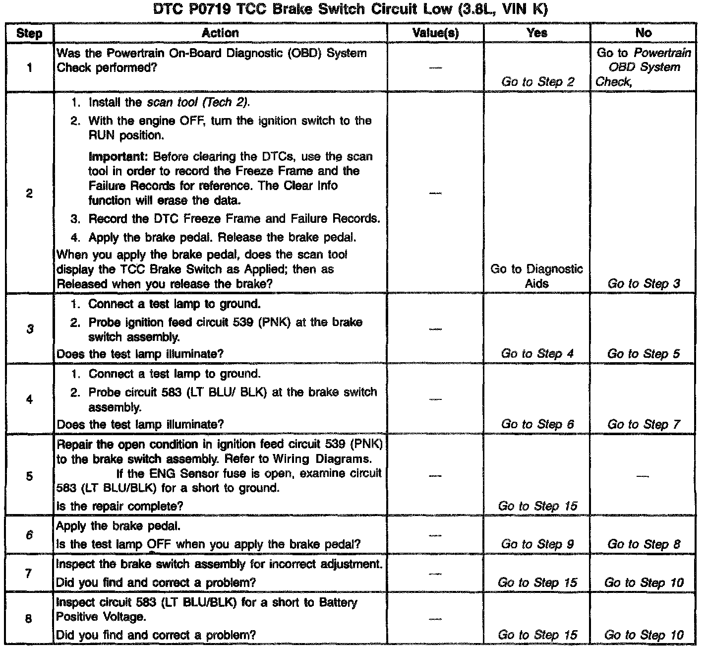 If pass conditions are not met, the TP is greater than 5%, and the VSS is greater than 56 km/h (35 mph) after the TP was greater than 10% and the VSS was greater then 64 km/h (40 mph), then the brake switch is disregarded for TCC scheduling. This action occurs before the DTC sets.