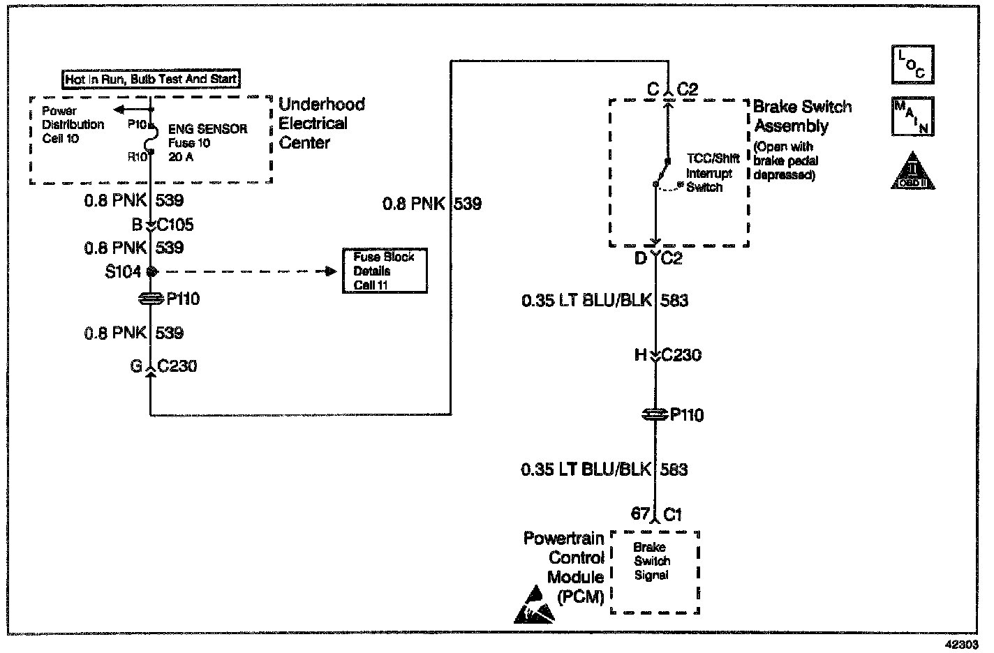 The Torque Converter Clutch (TCC)/Shift Interrupt switch indicates the status of the brake pedal. This normally-closed switch within the Brake Switch Assembly, supplies a B+ signal on the circuit 583 to the PCM. Applying the brake pedal opens the signal voltage circuit. The PCM de-energizes the TCC Solenoid Valve when the PCM receives the signal.