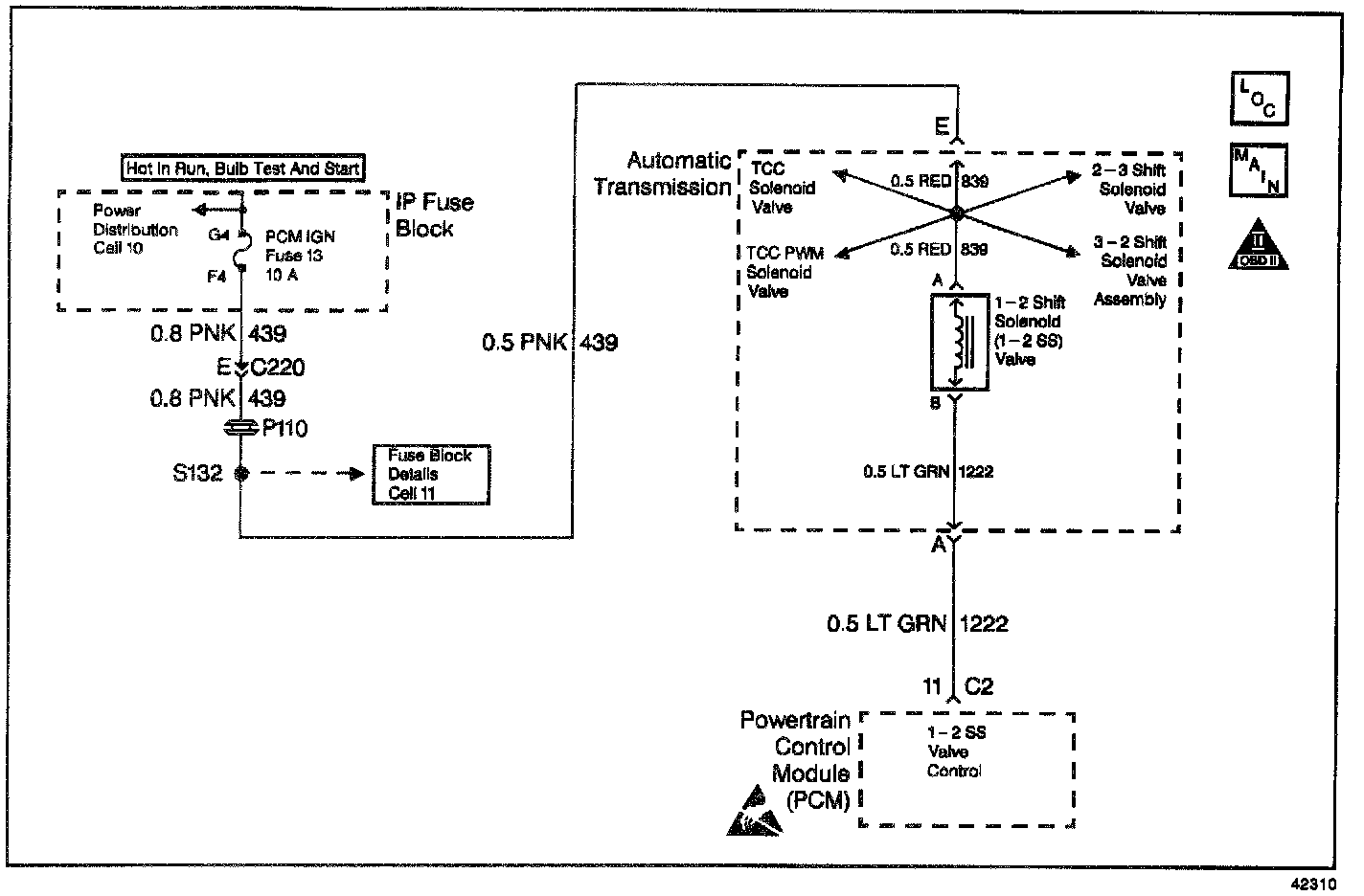 The 1-2 Shift Solenoid Valve (1-2 SS Valve) controls the fluid flow acting on the 1-2 and 3-4 shift valve. The solenoid is a normally-open exhaust valve. The combination of the 2-3 Shift Solenoid Valve and the 1-2 SS Valve allows four different shifting combinations. The solenoid attaches to the control valve body within the transmission. Circuit 439 supplies ignition voltage directly to the 1-2 SS Valve. The PCM controls the solenoid by providing a ground path through circuit 1222.