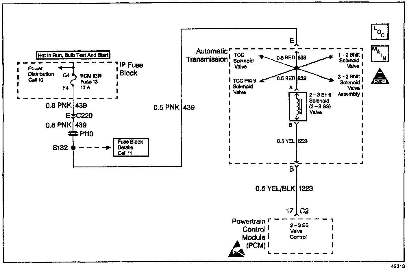 The 2-3 Shift Solenoid Valve (2-3 SS Valve) controls the fluid acting on the 2-3 shift valves. The solenoid is a normally-open exhaust valve. In combination with the 1-2 Shift Solenoid Valve, the 2-3 SS Valve allows four different shifting combinations. The solenoid is attached to the control valve body within the transmission. Circuit 439 supplies ignition voltage directly to the 2-3 SS Valve. The PCM controls the solenoid by providing the ground path through circuit 1223.