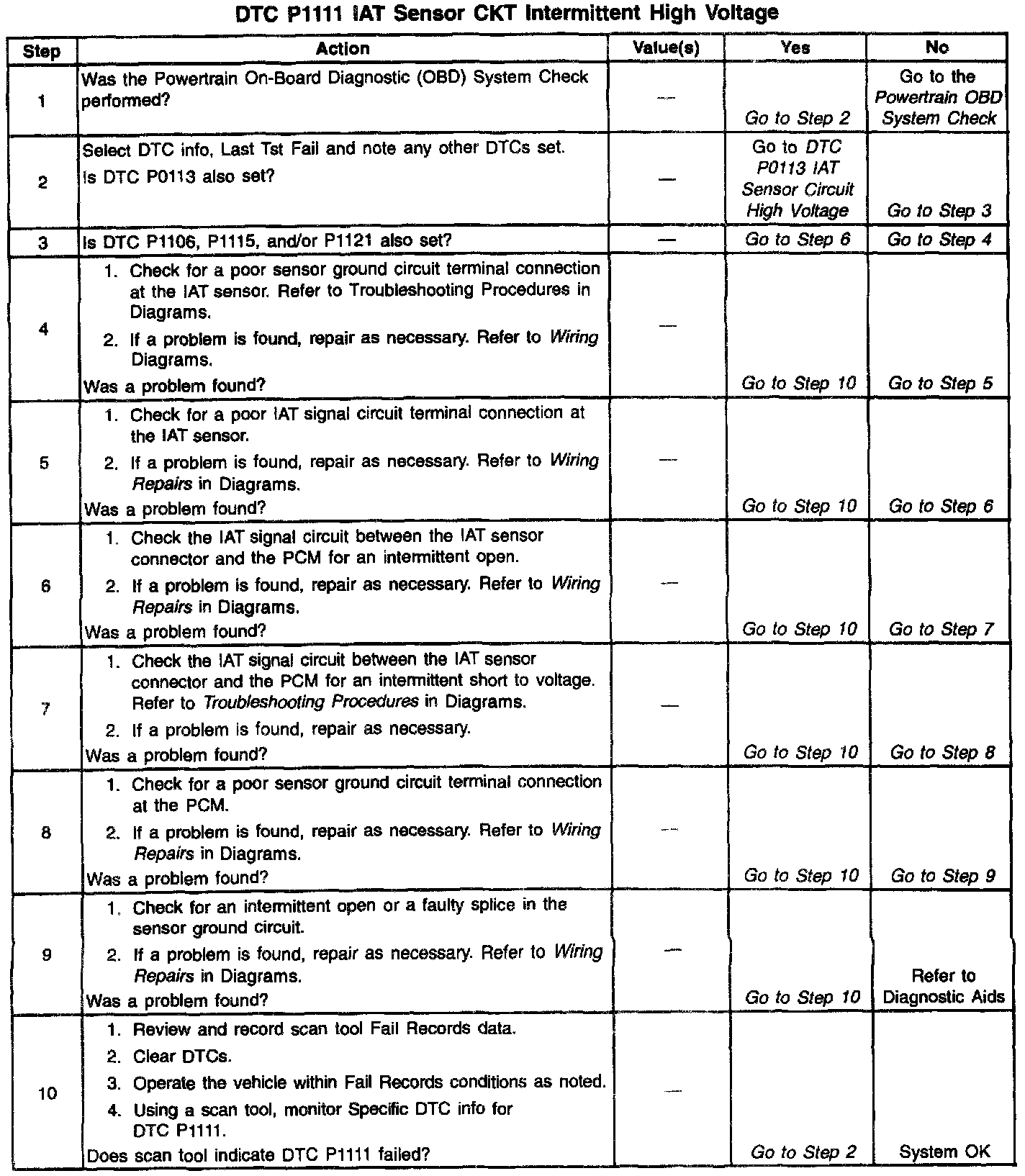 The Intake Air Temperature (IAT) sensor is a thermistor which measures the temperature of the air entering the engine. The PCM applies 5 volts through a pull-up resistor to the IAT sensor. When the intake air is cold, the sensor resistance is high and the PCM will monitor a high signal voltage on the IAT signal circuit. If the intake air is warm, the sensor resistance is lower causing the PCM to monitor a lower voltage. DTC P1111 will set when the PCM detects an intermittently high signal voltage on the intake air temperature sensor signal circuit.