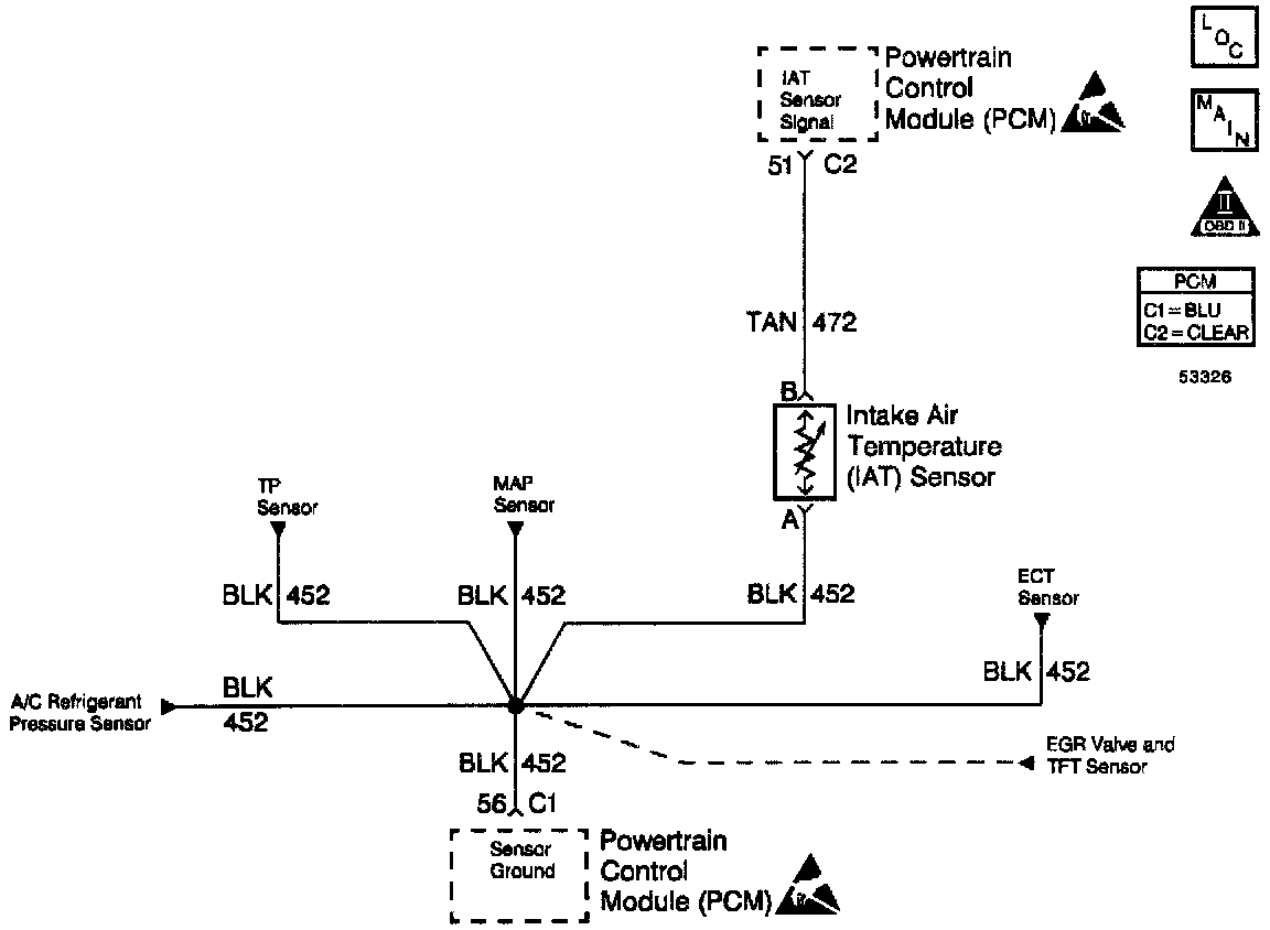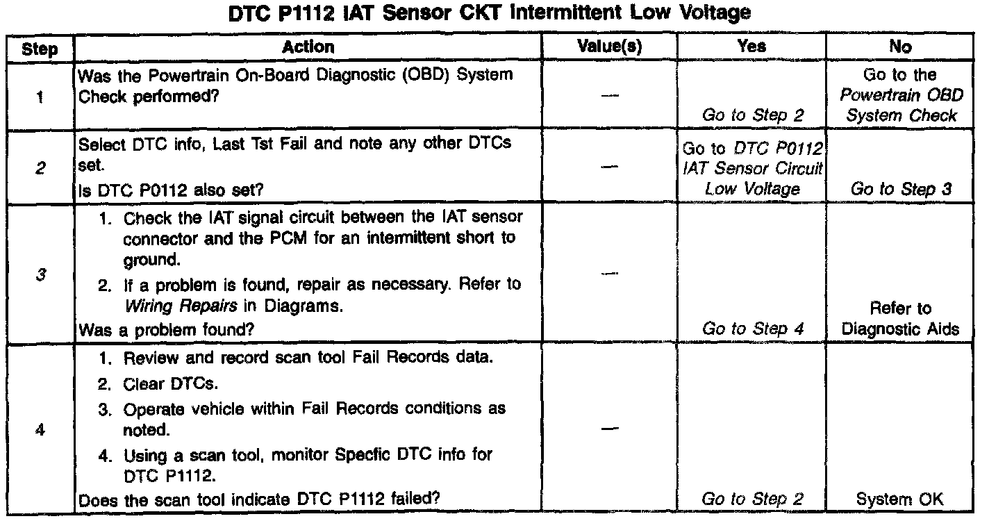 The Intake Air Temperature (IAT) sensor is a thermistor which measures the temperature of the air entering the engine. The PCM applies 5 volts through a pull-up resistor to the IAT sensor. When the intake air is cold, the sensor resistance is high and the PCM will monitor a high signal voltage on the IAT signal circuit If the intake air is warm, the sensor resistance is lower causing the PCM to monitor a lower voltage. DTC P1112 will set when the PCM detects an intermittently low signal voltage on the intake air temperature sensor signal circuit.
