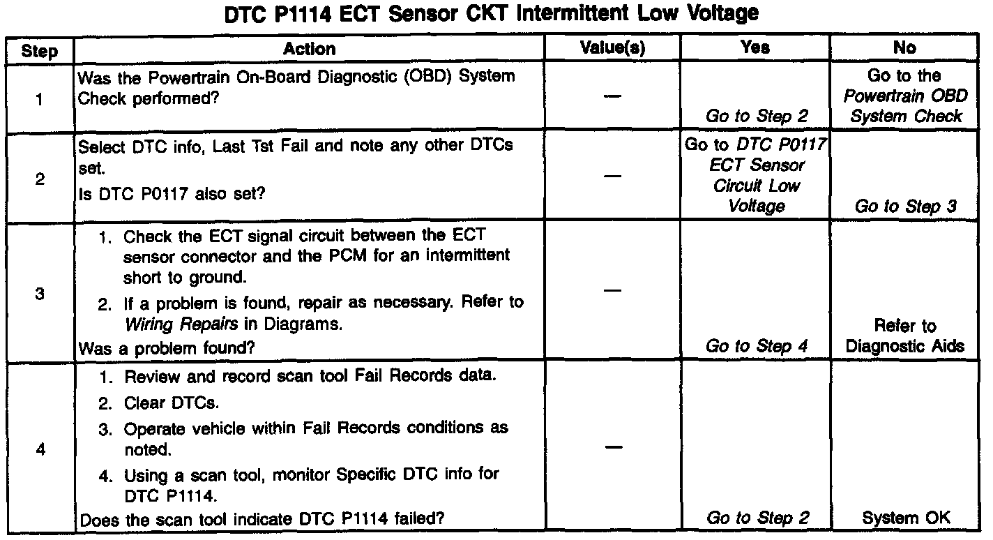 The Engine Coolant Temperature (ECT) sensor is a thermistor mounted in the engine coolant stream. The PCM applies a voltage (about 5.0 volts) through a pull up resistor to the ECT signal circuit. When the engine coolant is cold, the sensor (thermistor) resistance is high, therefore the PCM will measure a high signal voltage. As the engine coolant warms, the sensor resistance becomes less, and the ECT signal voltage measured at the PCM drops. With a fully warmed up engine, the ECT signal voltage should measure about 1.5-2.0 volts. If the PCM detects an ECT signal that is intermittently below the range of the ECT sensor, DTC P1114 will set.