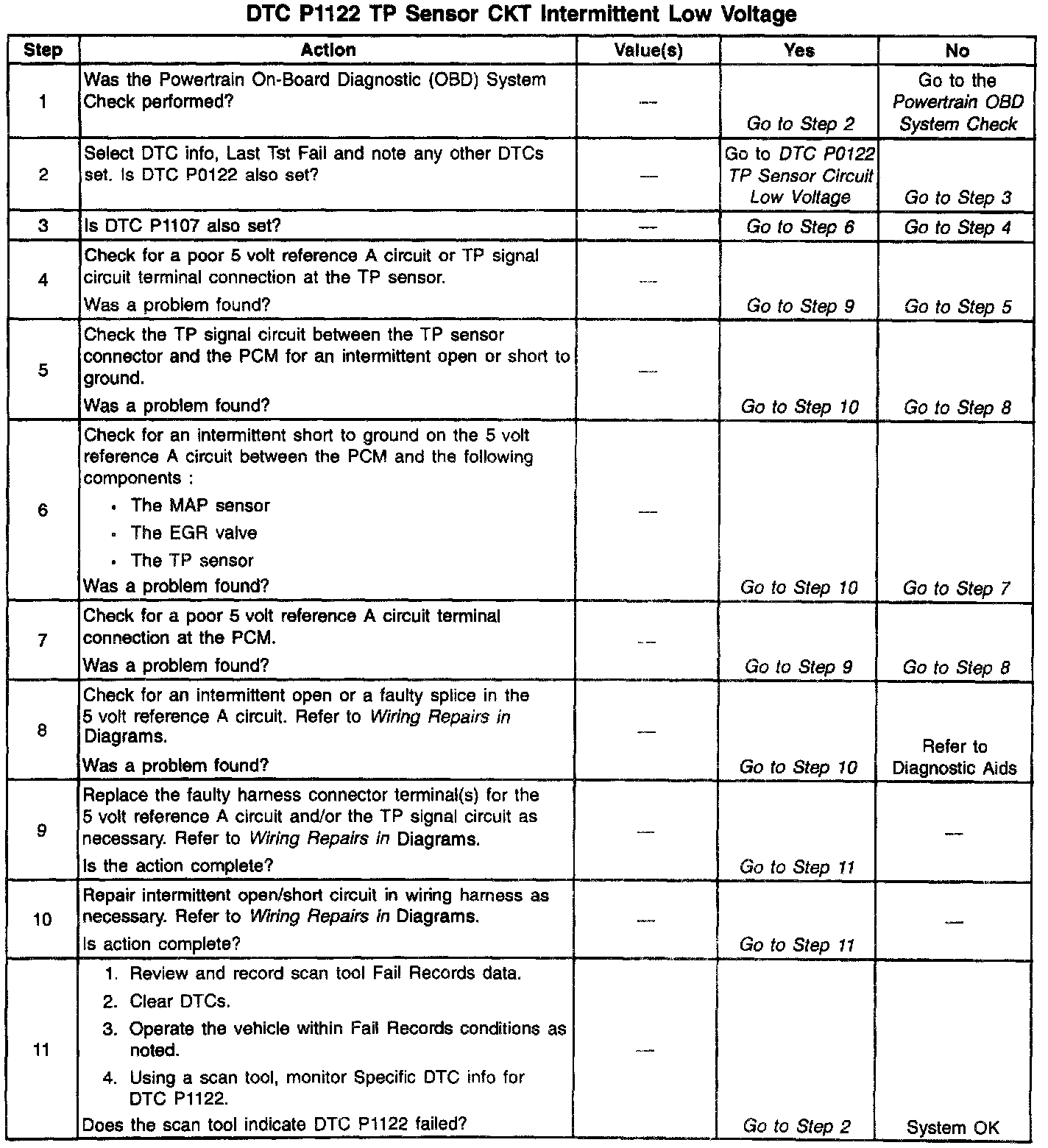 If DTC P1122 cannot be duplicated, reviewing the Fail Records vehicle mileage since the diagnostic test last failed may help determine how often the condition that caused the DTC to be set occurs. This may assist in diagnosing the condition.
