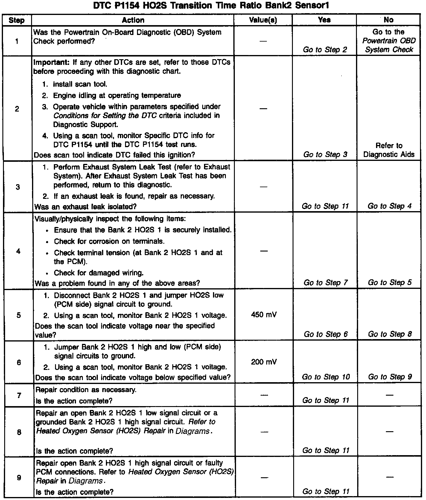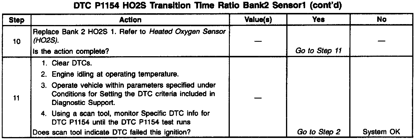 A malfunction in the HO2S heater ignition feed or ground circuit may cause a DTC P1154 to set. Check HO2S heater circuitry for intermittent faults or poor connections. If connections and wiring are OK and DTC P1154 continues to set, replace the Bank 2 HO2S 1. Review the Fail Records vehicle mileage since the diagnostic test last failed. This may help determine how often the condition that caused the DTC to be set occurs.