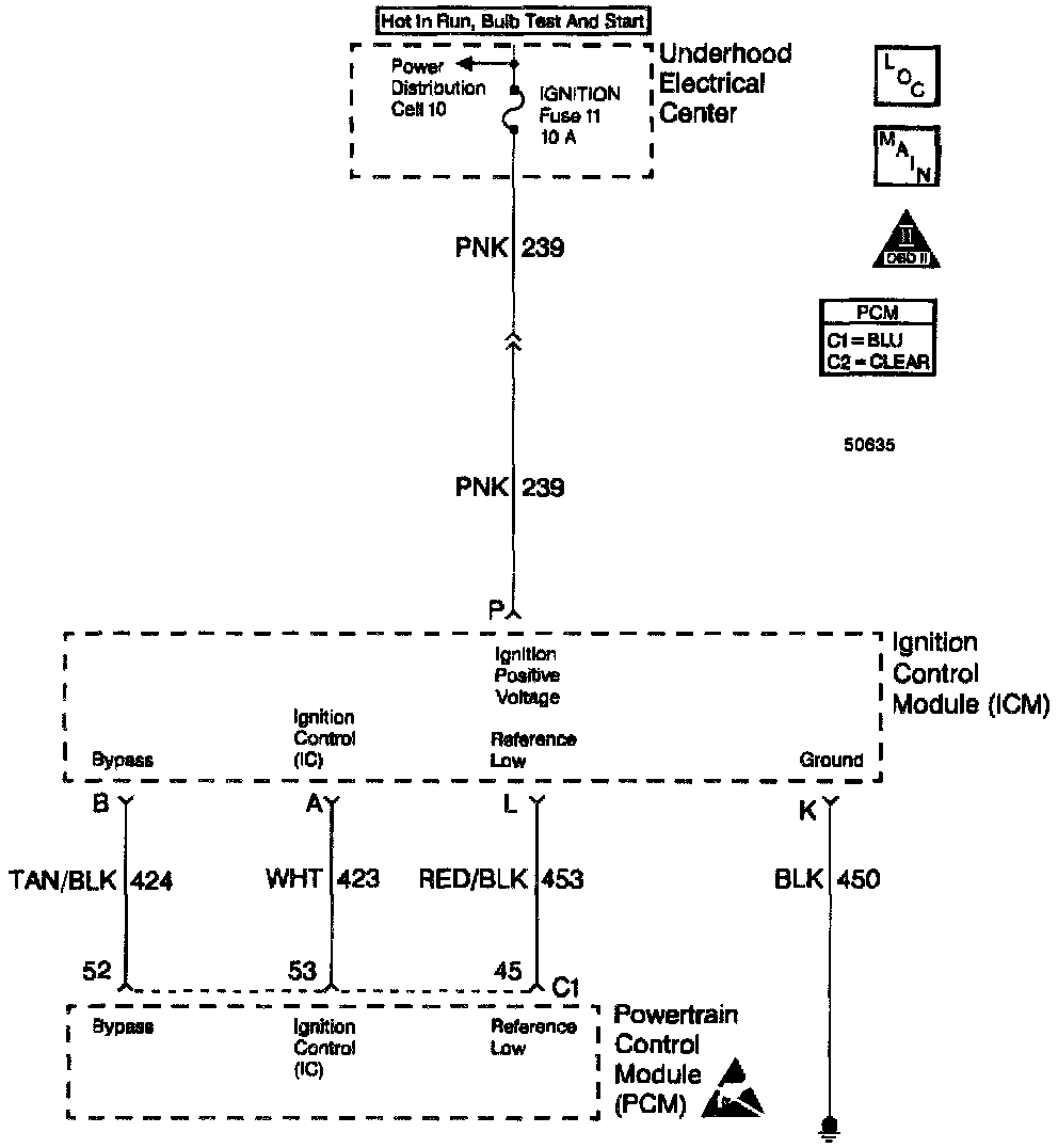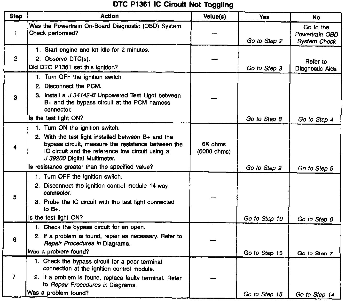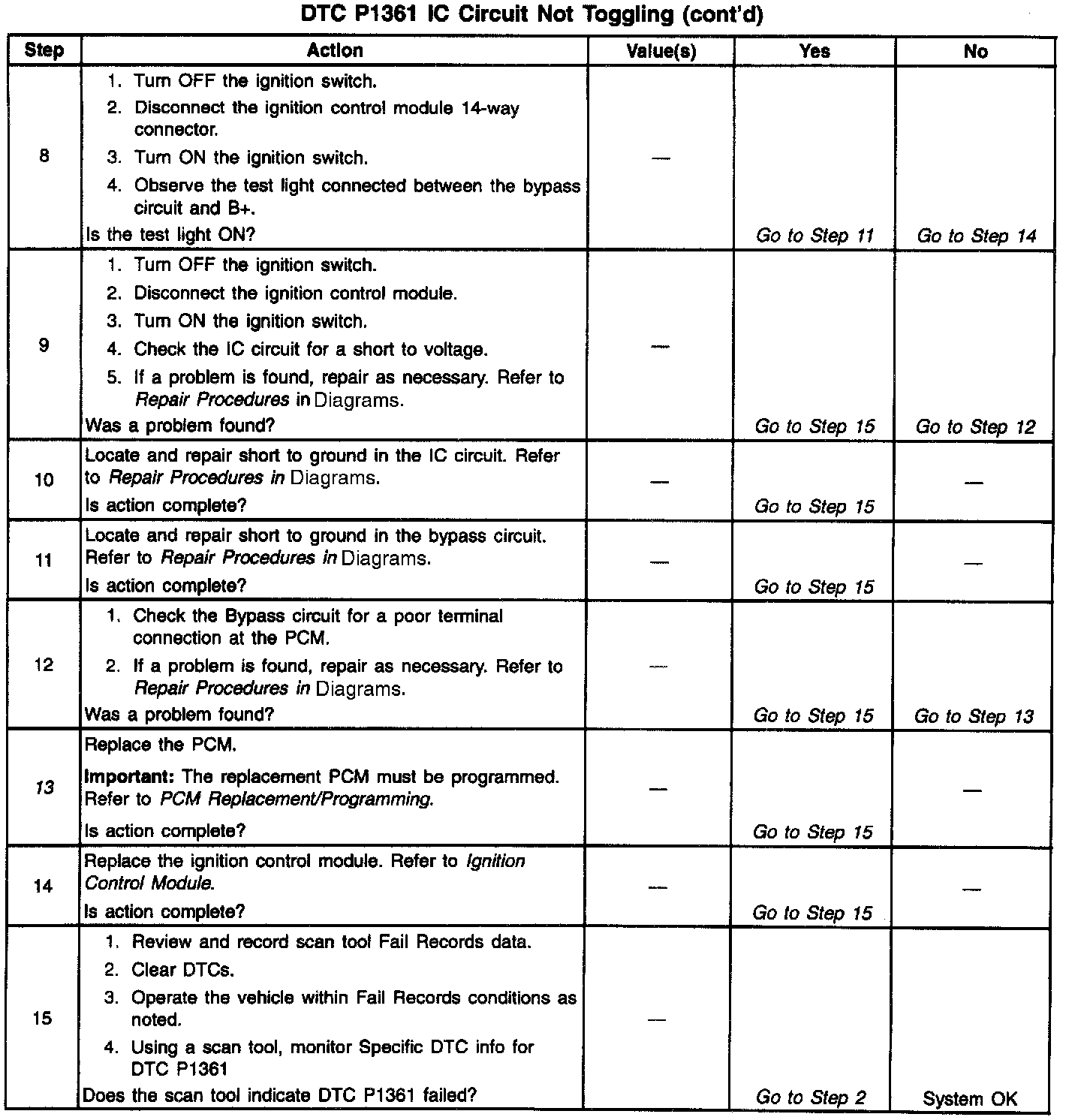 The Ignition Control Module (ICM) sends signals that the PCM requires for fuel control and spark advance calculations. At the start of engine crank, the ICM controls spark advance (Bypass mode). When the second 3X reference pulse is recognized by the PCM, the PCM applies 5 volts to the Bypass circuit. The 5 volts on the Bypass circuit commands the ICM to switch spark advance to PCM control (IC mode). At this time, The ICM will remove the ground it has applied to the IC circuit. When the IC pulses are not grounded, the ICM can use the IC pulses to control spark advance. A short in the IC circuit or an open or short to ground in the Bypass circuit will cause the PCM to monitor no IC pulses after the PCM has switched the Bypass circuit ON. The PCM will set DTC P1361 under either of these conditions. The engine may be started but will run on Bypass mode timing.
