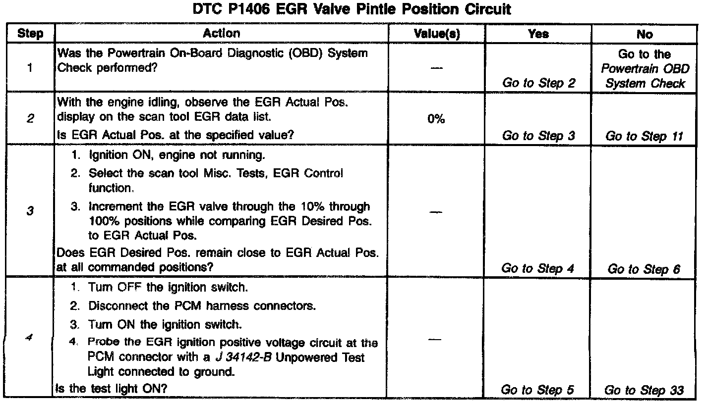 The PCM monitors the EGR valve pintle position input to ensure that the valve responds properly to commands from the PCM and to detect a fault if the pintle position sensor and control circuits are open or shorted. If the PCM detects a pintle position signal voltage outside the normal range of the pintle position sensor, or a signal voltage that is not within a tolerance considered acceptable for proper EGR system operation, the PCM will set DTC P1406.