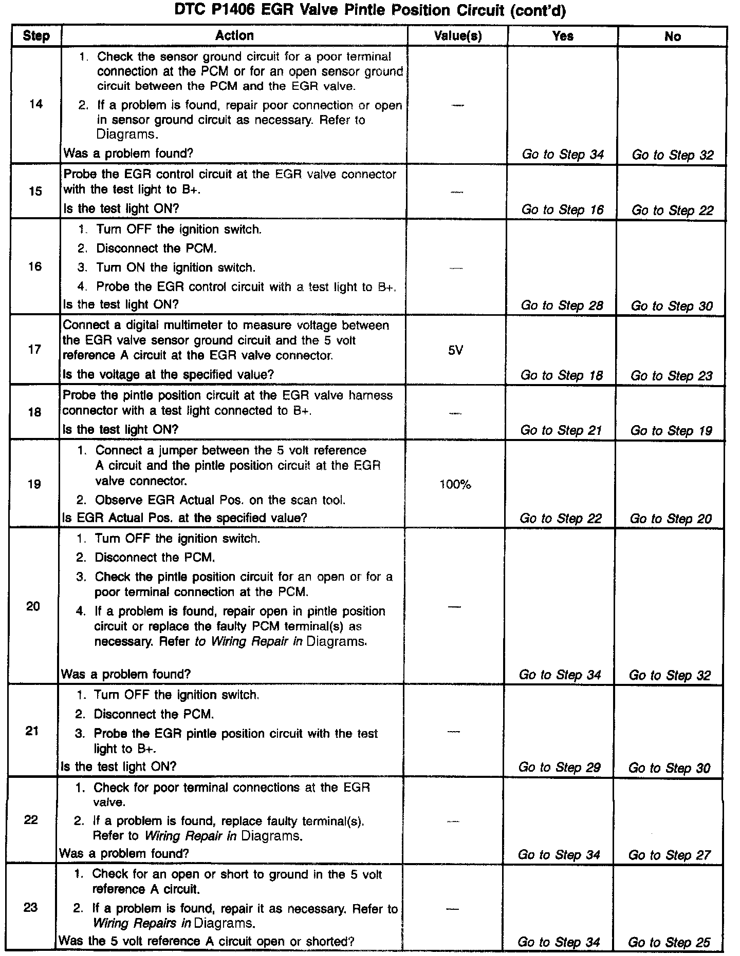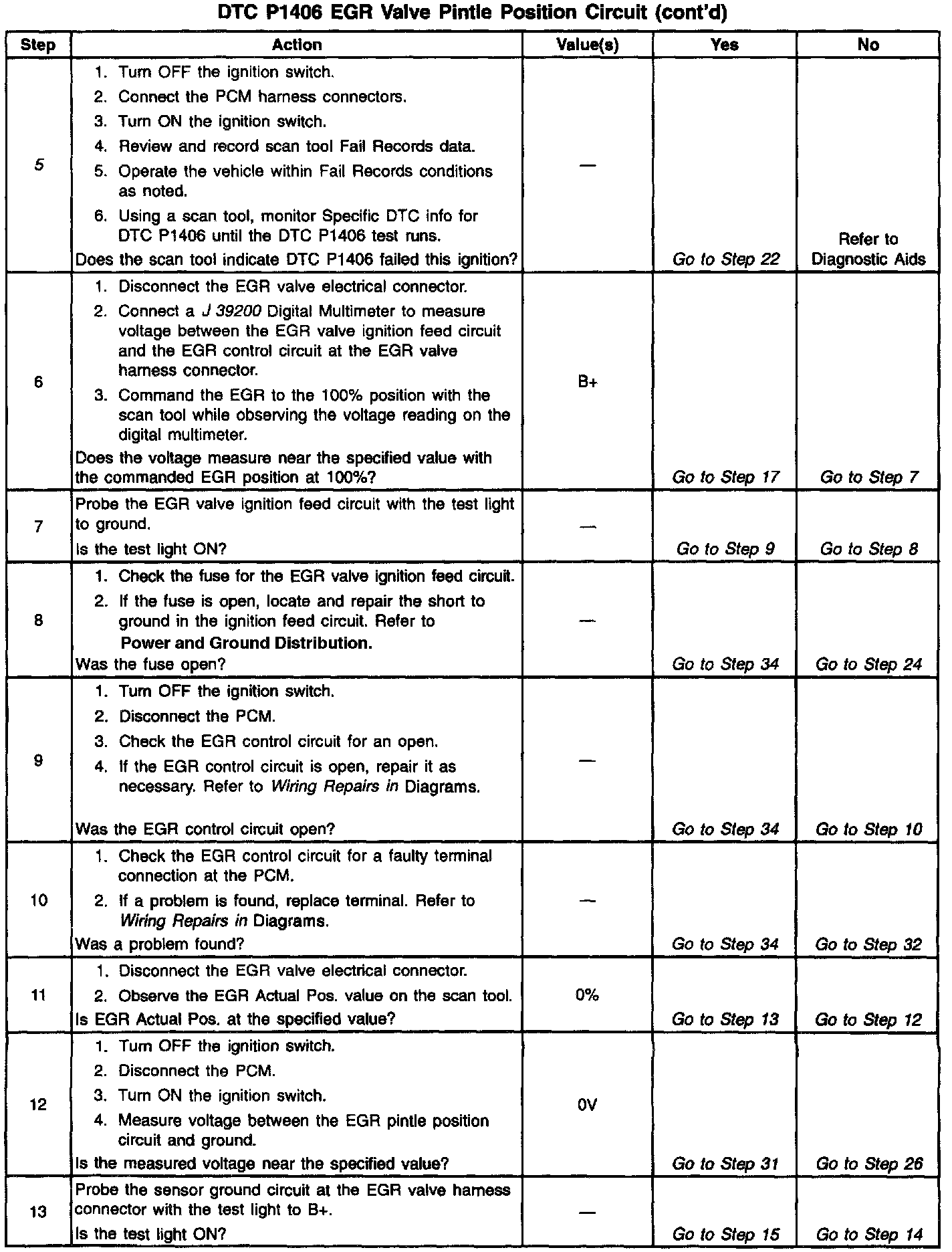 5. If DTC P1406 will only set under certain conditions, the fault may be intermittent; refer to DTC P1406 Diagnostic Aids. If an intermittent wiring problem is not present, check for a faulty connection at the PCM or the EGR valve. If the connections are OK and DTC P14O6 continues to set, replace the EGR valve. Go to EGR Valve.
