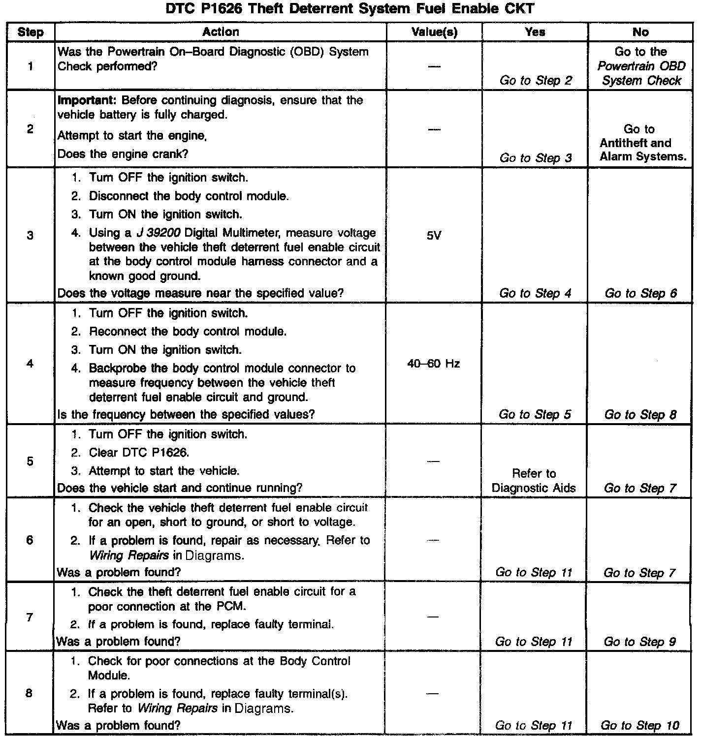 The Vehicle Theft Deterrent (VTD) module produces the Theft Deterrent Fuel Enable signal when ignition is ON and the proper key resistor pellet is sensed by the Vehicle Theft Deterrent module. The PCM monitors the Fuel Enable signal during crank. If the proper signal is present on the Theft Deterrent Fuel Enable circuit, the PCM enables fuel delivery to allow the engine to start. If the PCM detects that the fuel enable signal is not present or incorrect while the engine is running, DTC P1626 will be set. The engine will continue to start and run as long as DTC P1626 is stored and the fault condition affects only the Theft Deterrent Fuel enable circuit. If the problem affects inputs to the Vehicle Theft Deterrent module, the starter motor may be disabled. If this condition is present, refer to Vehicle Theft Deterrent System for further diagnosis.