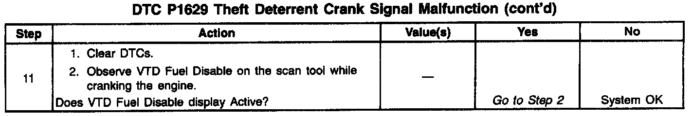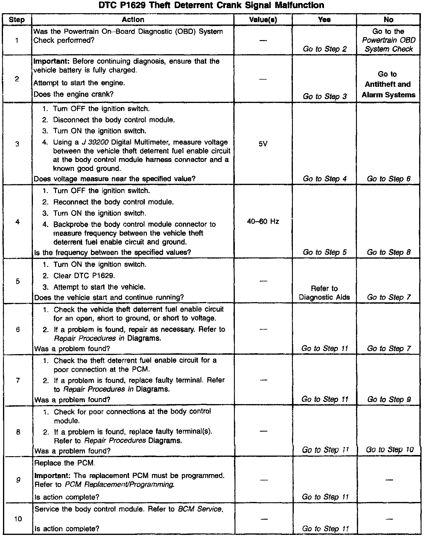 The Vehicle Theft Deterrent (VTD) module produces the Theft Deterrent Fuel Enable signal when ignition is ON and the proper key resistor pellet is sensed by the Vehicle Theft Deterrent module. The PCM monitors the Fuel Enable signal during crank. If the proper signal is present on the Theft Deterrent Fuel Enable circuit, the PCM enables fuel delivery to allow the engine to start. If the PCM detects that the fuel enable signal is not present or incorrect while an attempt is made to start the engine, DTC P1629 will be set The engine will not start as long as this condition is present. If the problem also affects inputs to the Vehicle Theft Deterrent module, the starter motor may be disabled. If this condition is present, refer to Vehicle Theft Deterrent System for further diagnosis.