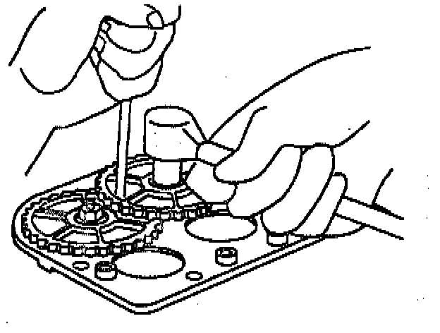 NOTE: Do not allow gear to turn while removing the retaining nut, since the modulator piston can hit the top of the modulator bore, damaging the piston. Turn the modulator gear to position the piston in the center of its travel. Place a screwdriver through the holes in the gears (not between the gears) into the recessed hole in the modulator base. This will prevent the gear from turning, aiding in gear removal. Do not allow gear to turn while tightening the retaining nut, since the modulator piston can bottom out in the modulator bore damaging the piston. Turn the modulator gear to position the piston in the center of its travel. Place a screwdriver through the holes in the gears (not between the gears) into the recessed hole in the modulator base. This will prevent the gear from turning, aiding in gear installation.