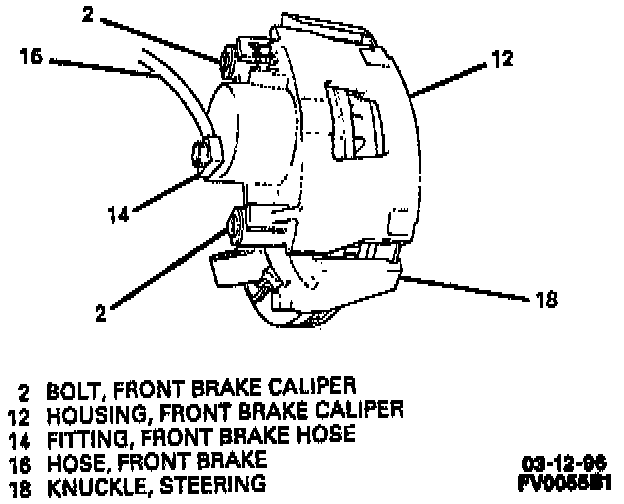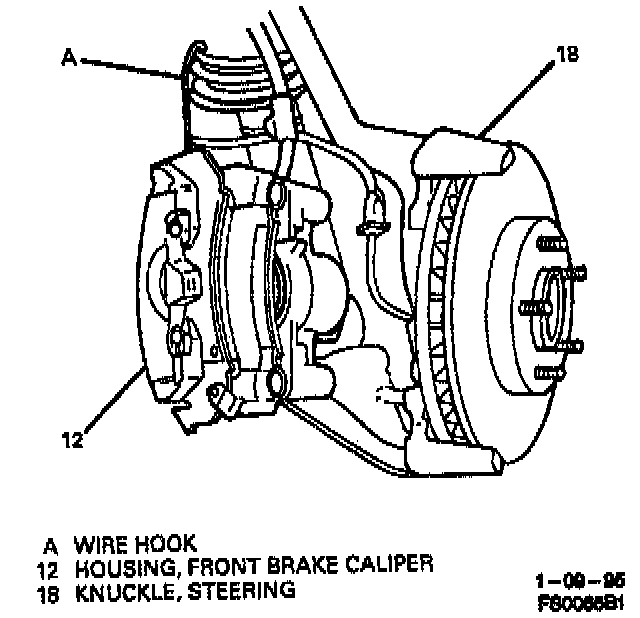 8. Caliper from rotor (1) and knuckle (18). If caliper is not being removed from vehicle for unit repair, suspend it from front suspension using a fabricated wire hook.