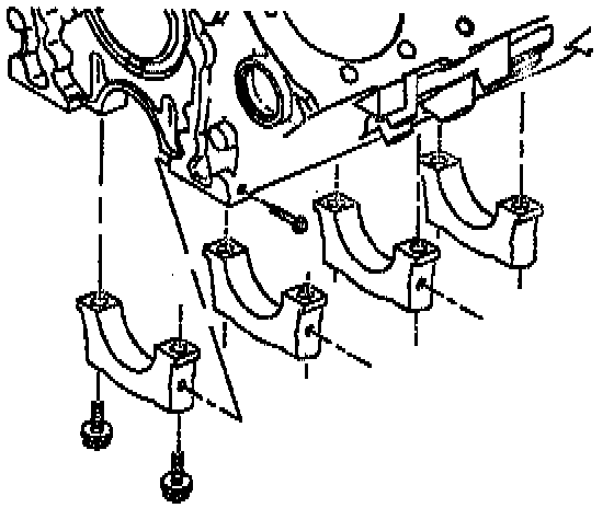 3. Install the crankshaft bearing caps with the assembled crankshaft bearings inside and with the arrows pointing to the front of the engine.