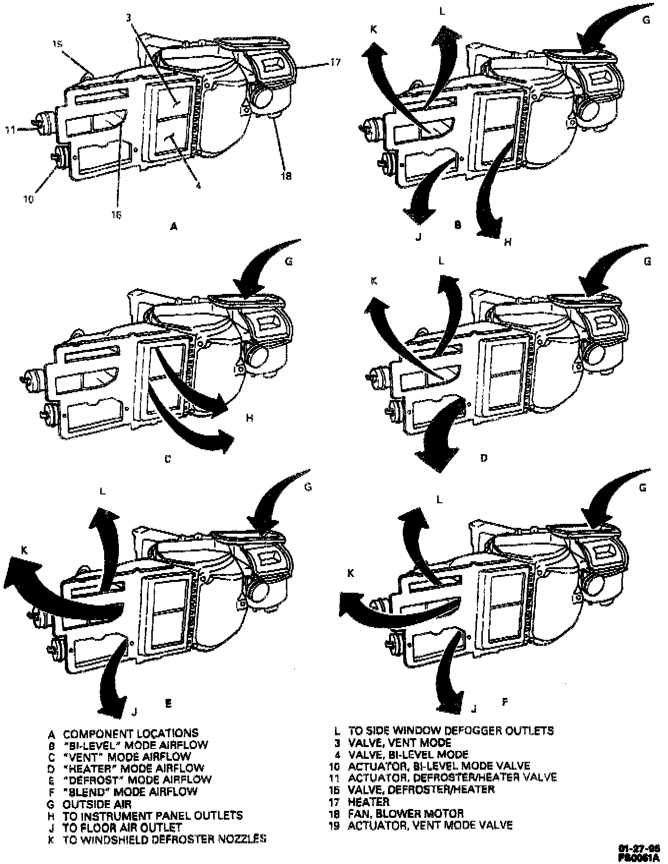 With the ignition switch in the "RUN" position, the blower motor flits in all mode control knob positions except "OFF" " Blower motor speed is controlled by a four-position electrical blower switch at the left side of the control. The blower switch provides a choice of low blower motor Speed, two medium blower motor speeds and a high blower motor speed