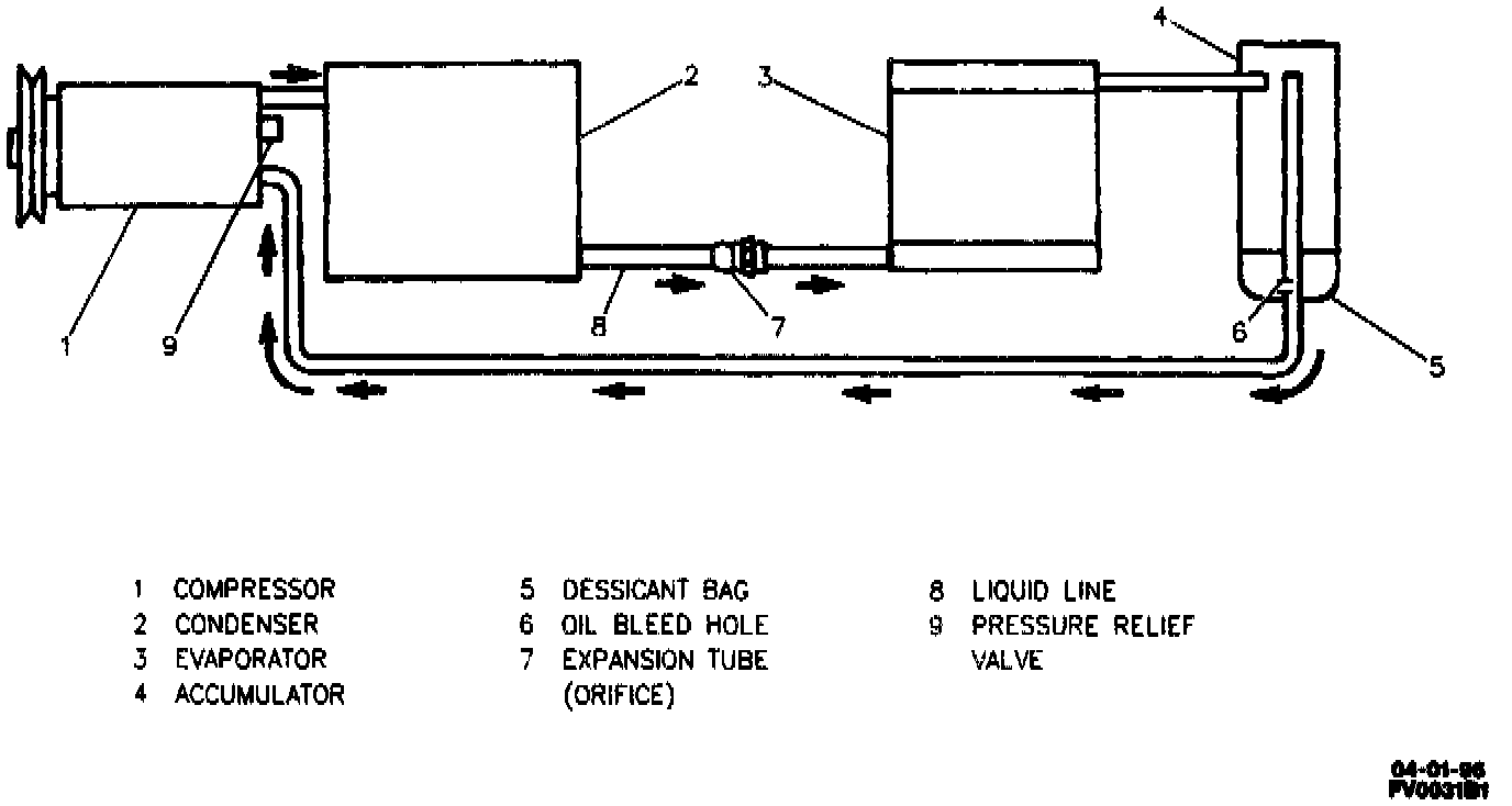 The evaporator is a device which cools and dehumidifies the air before it enters the vehicle. High-pressure refrigerant flows through the thermostatic expansion valve (5.7L VIN P) or the orifice tube (3800 VIN K) and becomes low-pressure refrigerant before entering the evaporator. The heat in the air passing through the evaporator core is lost to the cooler surface of the core, thereby cooling the air. As the process of heat loss from the air to the evaporator core surface is taking place, any moisture (humidity) in the air condenses on the outside of the evaporator core and is drained off as water.