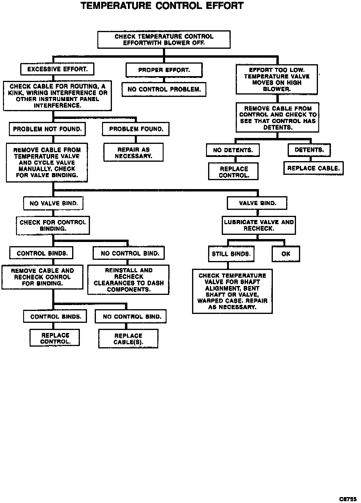 A kinked control cable, a binding valve or a faulty control are possible causes of excessive temperature control knob effort. For an organized diagnosis procedure, refer to Figure.