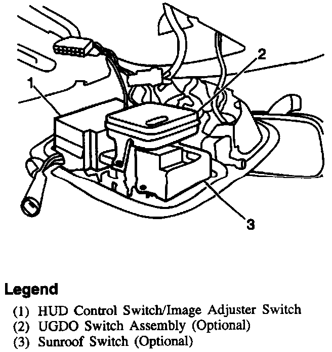 1. Fasteners to HUD control switch or image adjuster switch at overhead console.