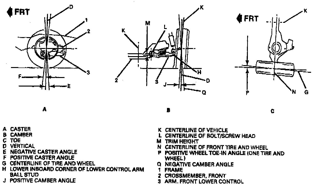 Toe is a measurement of how much the front tires and wheels are turned in or out from a straight-ahead position. When the tires and wheels are turned in, toe is positive (+). When the tires and wheels are turned out, toe is negative (-). The actual amount of toe is normally only a fraction of a degree. The purpose of toe is to ensure that the tires and wheels roll parallel. Toe also serves to offset the small deflections of the tire and wheel support system which occur when the vehicle is rolling forward. In other words, even when the tires and wheels are set to toe in or out slightly when the vehicle is standing still, they tend to roll parallel on the road when the vehicle is moving. Toe affects tire wear.