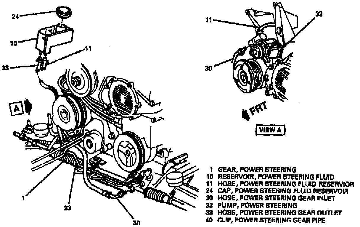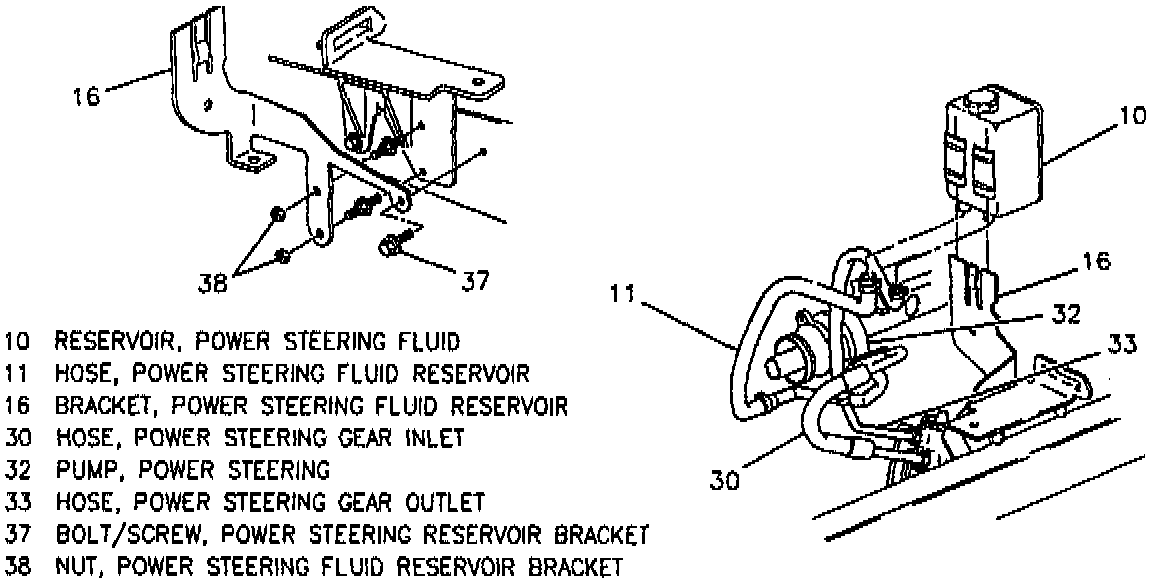 1. Reservoir hose (11) to reservoir (10) using clamp. Lubricate with power steering fluid as required.