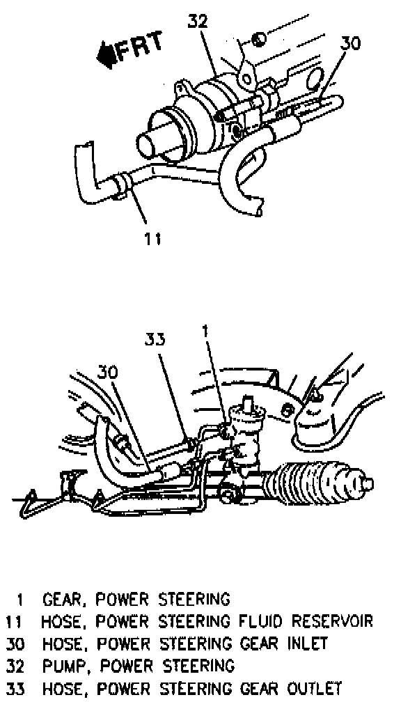 3. Power steering gear inlet and outlet hoses (30 and 33) from steering gear(1).