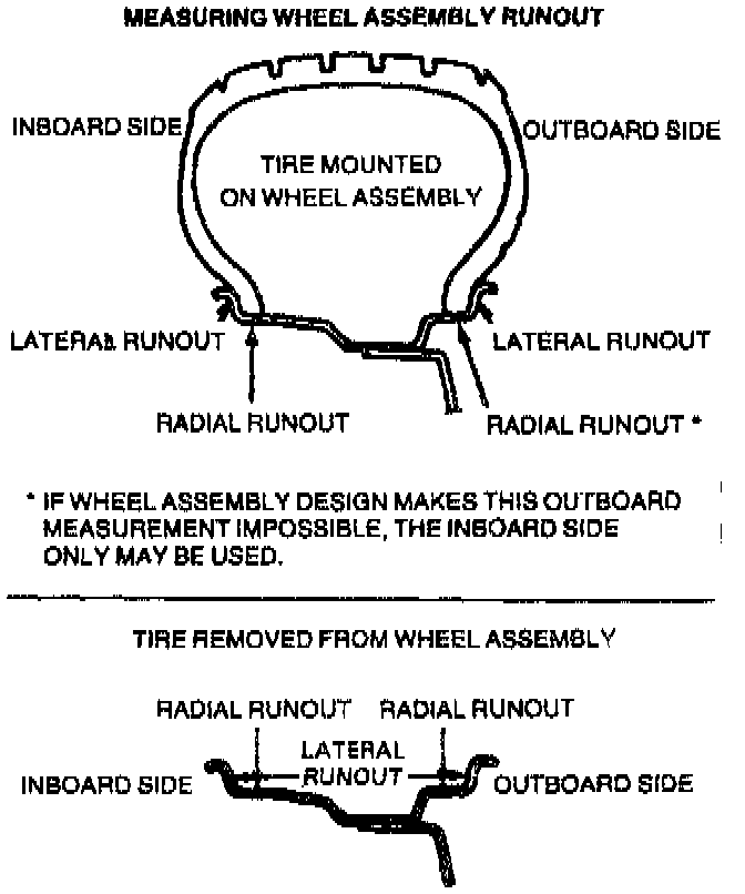 Wheel runout should be measured with an accurate dial indicator. Measurements may be taken with the wheel installed on the vehicle, or off the vehicle using an accurate mounting surface such as a wheel balancer. Measurements may be taken with or without the tire mounted on the wheel. Radial runout and lateral runout should be measured on both the inboard and outboard rim flanges. With the dial indicator firmly in position, slowly rotate the wheel one revolution and record the total indicator reading. If any measurement exceeds specifications, and there is a vibration that wheel balancing will not correct, the wheel should be replaced. Disregard any indicator readings caused by welds, paint runs, or scratches.