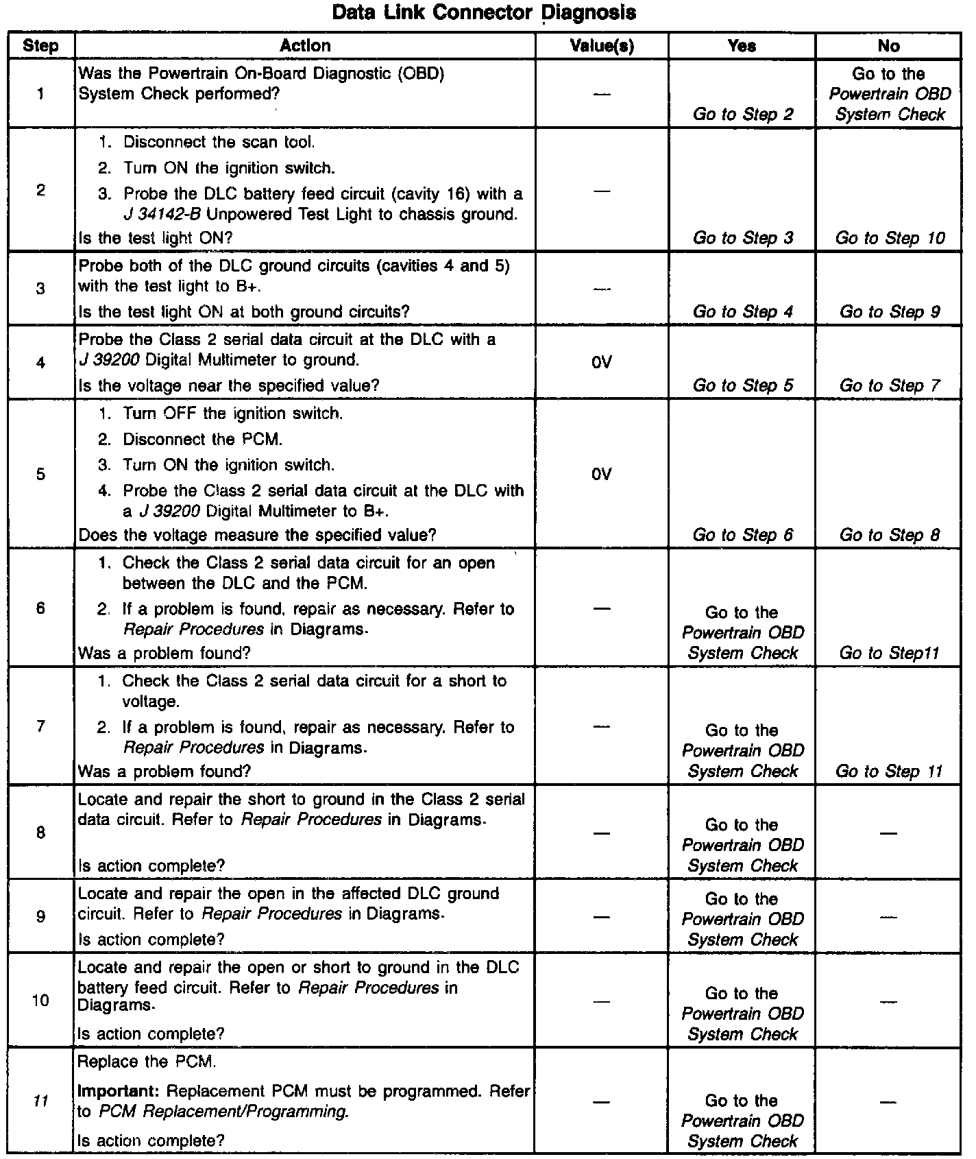The Class 2 serial data circuit to the Data Link Connector (DLC) allows bi-directional communication between the PCM and the scan tool. If communication between the scan tool and the PCM cannot be established, the procedure in the DLC Diagnosis table should be used to diagnose the condition.