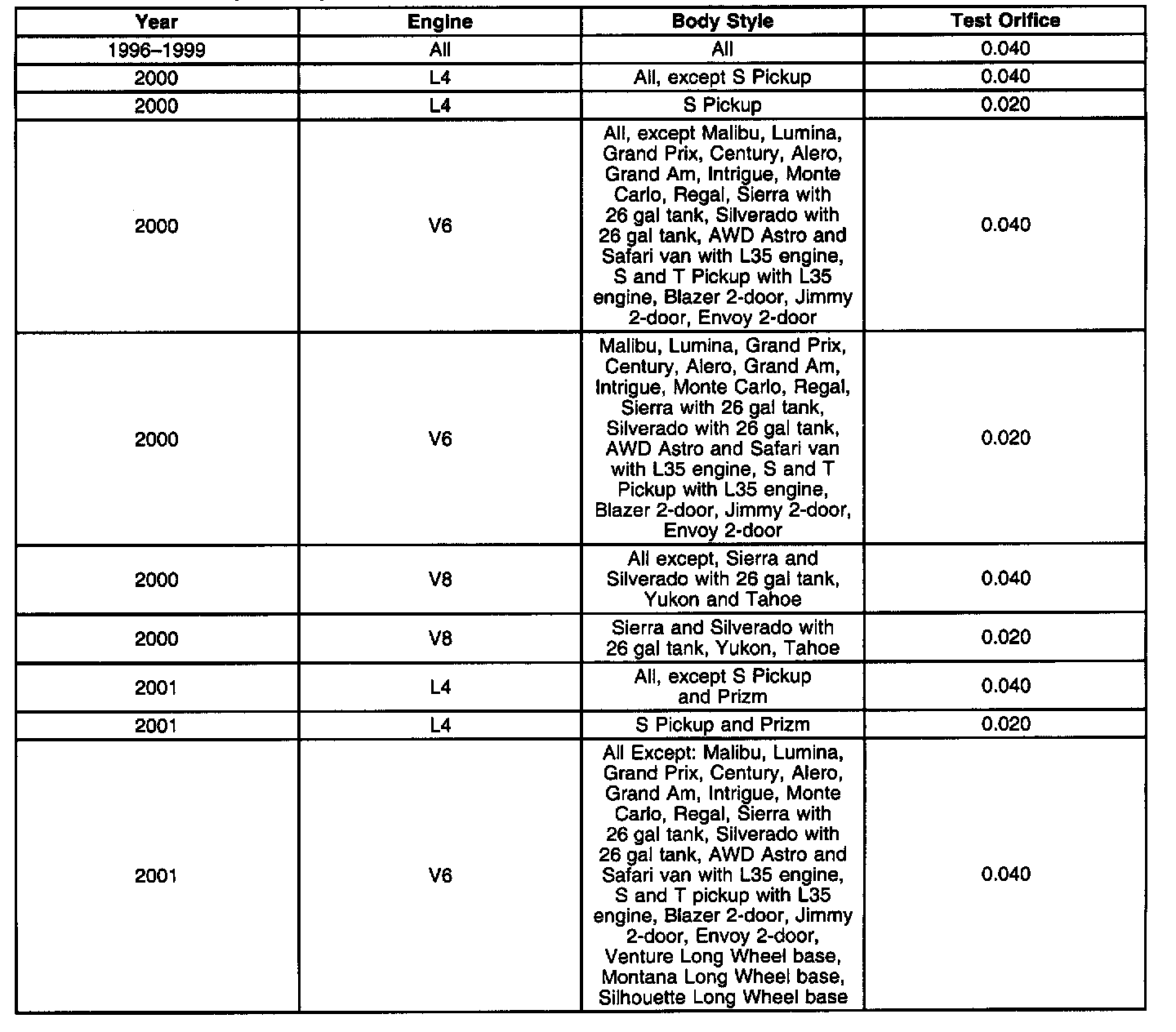 The chart shown should be used to select the correct orifice for the Verification Process if the Service information does not specifically list the information.