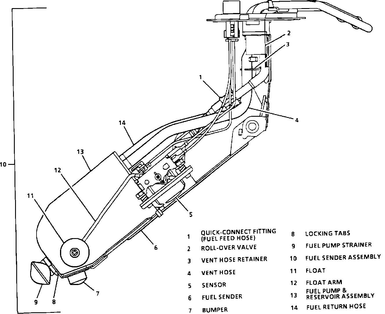 The fuel tank unit consists of the following major components: a fuel sender, fuel pump and reservoir assembly, and a fuel pump strainer.