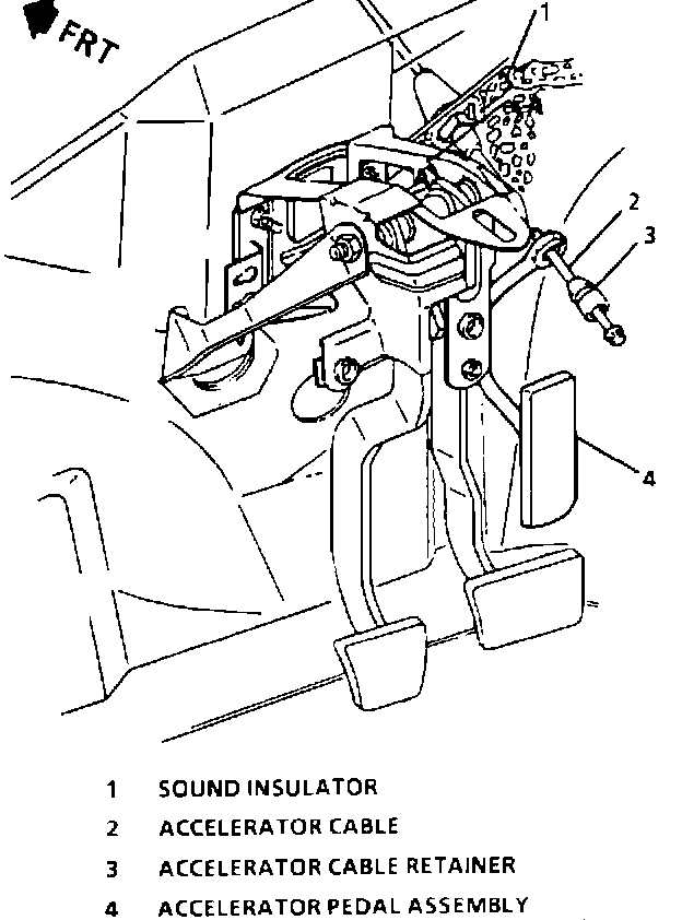 2. Accelerator cable through slot in accelerator pedal lever. Seat retainer in lever.