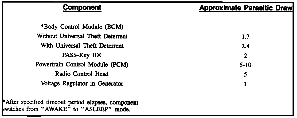11. If the current draw is above specifications listed in component parasitic load chart, remove system maxi-fuses and circuit breakers one at a time until current draw returns to a value less than or equal to specifications listed. This should be done while monitoring ammeter so that a disruption of drain will be evident. Perform steps 9 and 10 each time a fuse is removed. Total readings in the hundreds of milliamps may suggest grounded wires, sticking relays, or small lamps remaining lit.