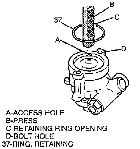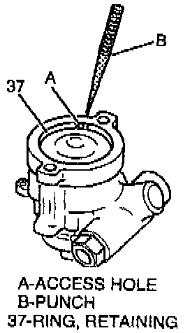 14. Retaining ring (37) into groove in pump housing (10), with ring opening near access hole in pump housing.